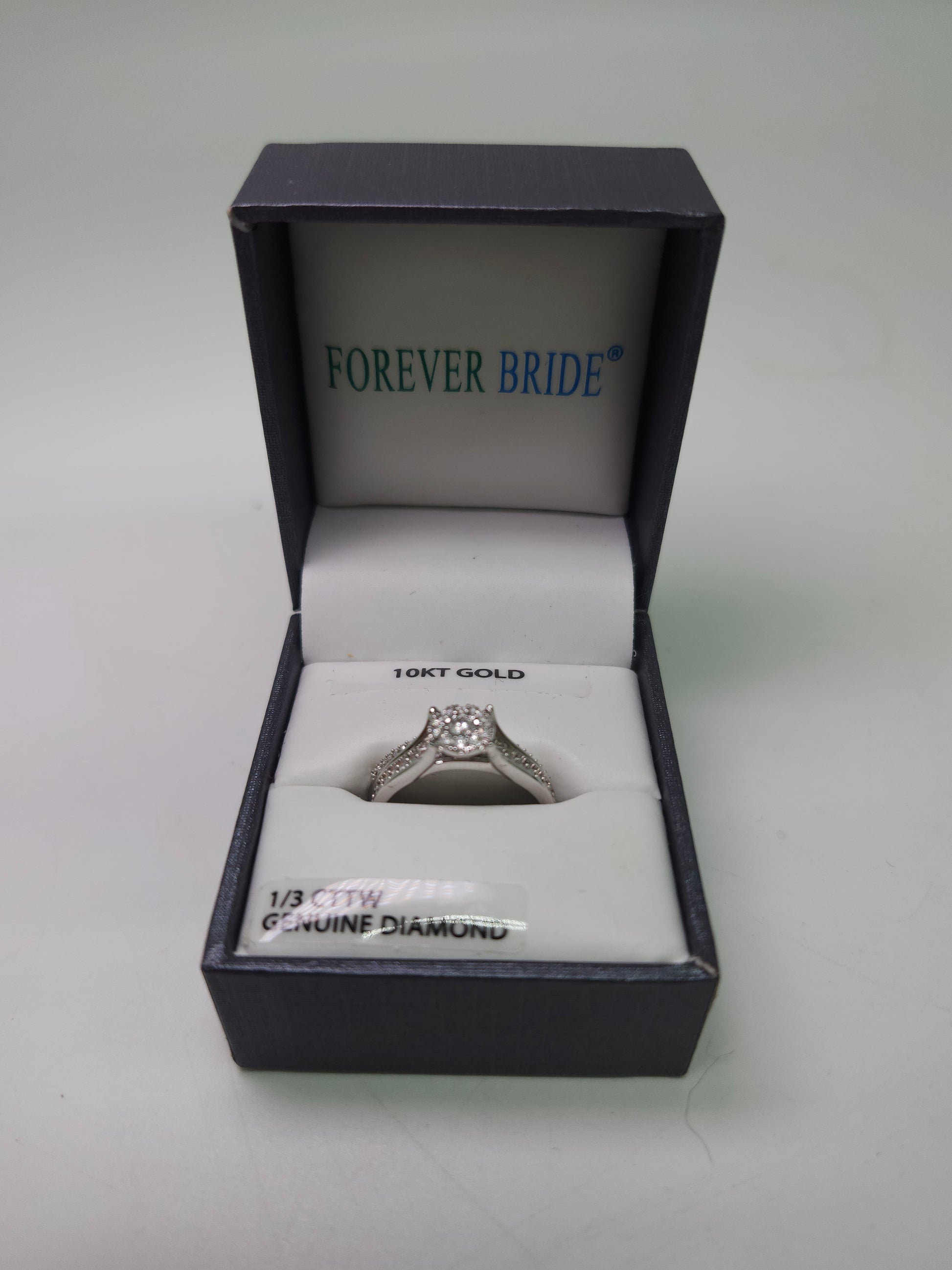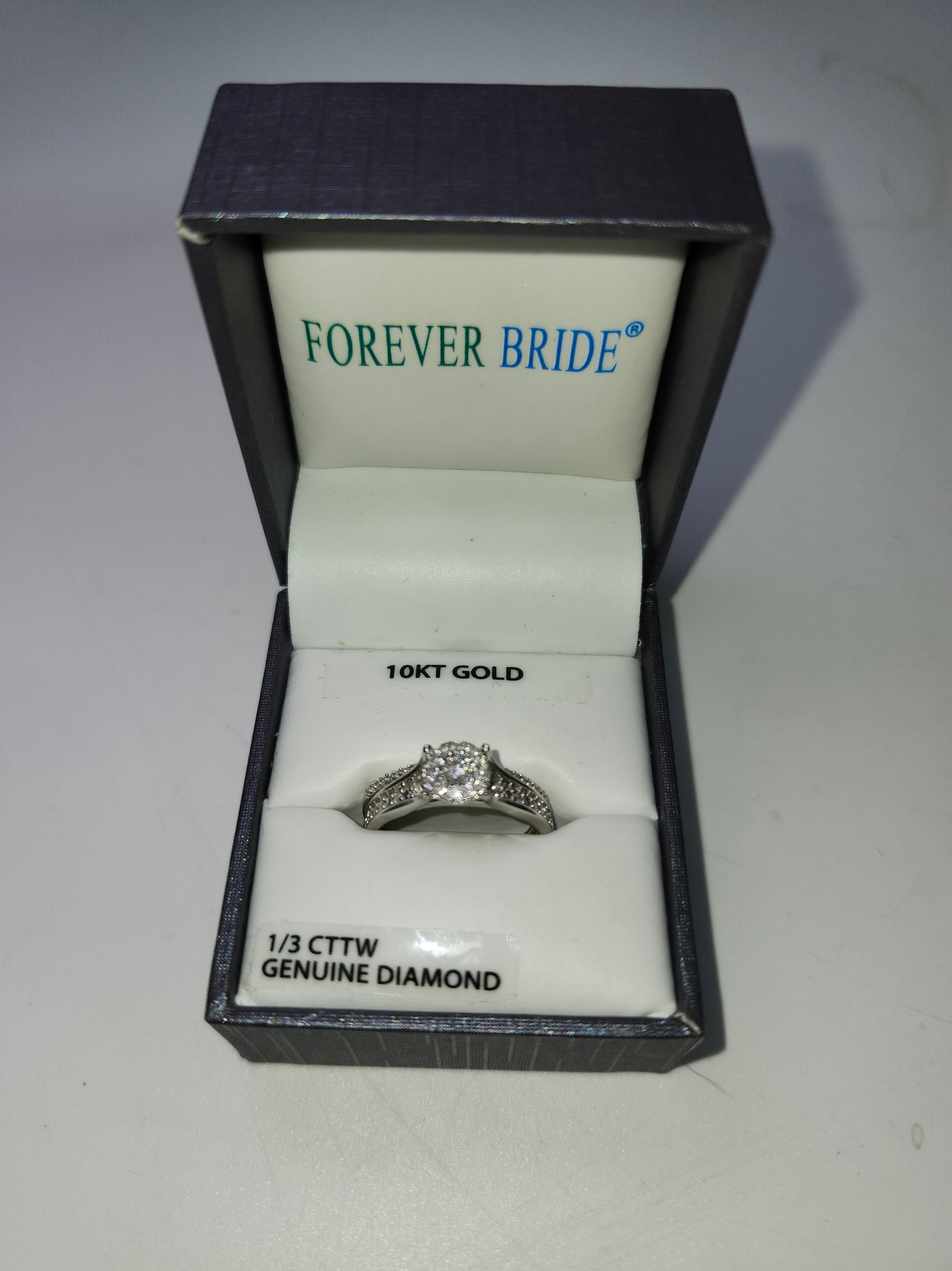 *10K White Gold 1/3 CTTW Diamond Ring Set, lab diamonds, made by "Forever Bride." Large ring weighs 2.58 grams, small ring weights .79, total weight: 3.37 grams of 10K and 1/3 cttw diamonds. Acid tested