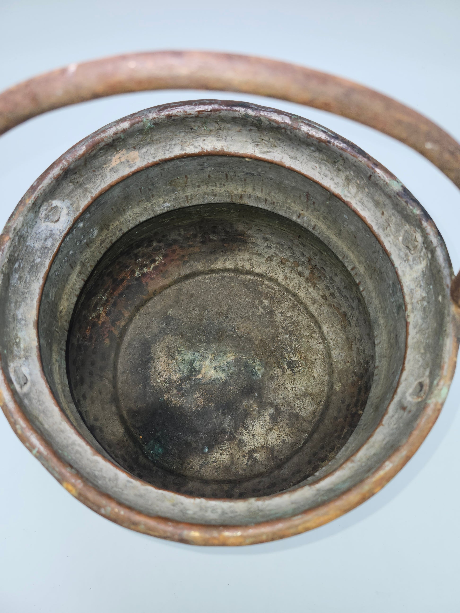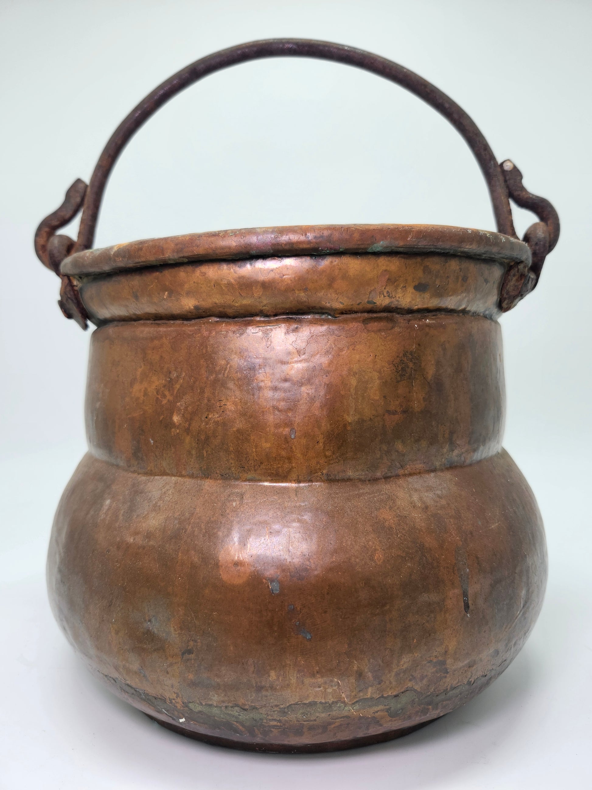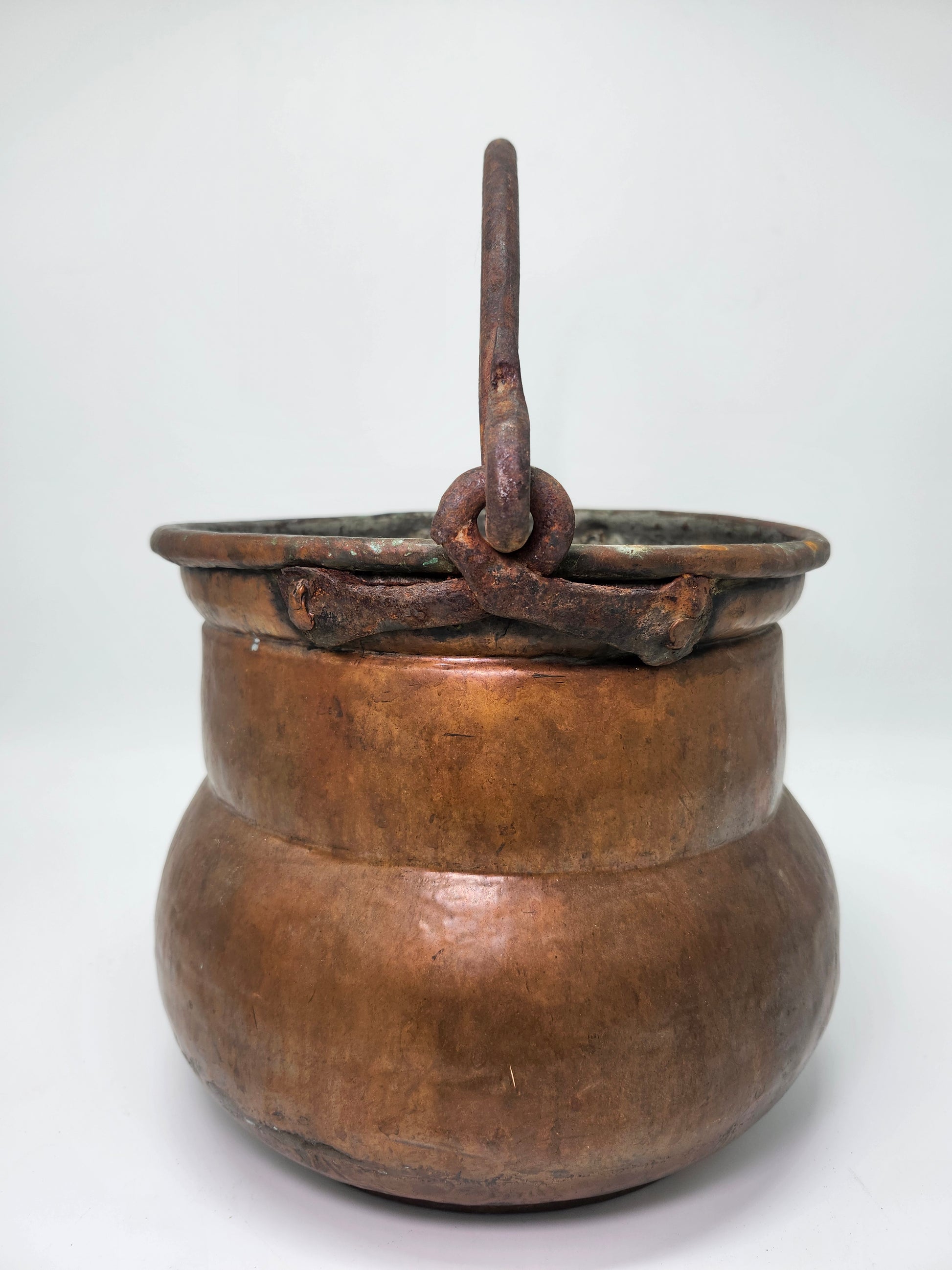 18th Century Antique Early American All Copper Pot, hand-wrought, top handle to hang over fire, great for a farmhouse vibe or any antique collector.