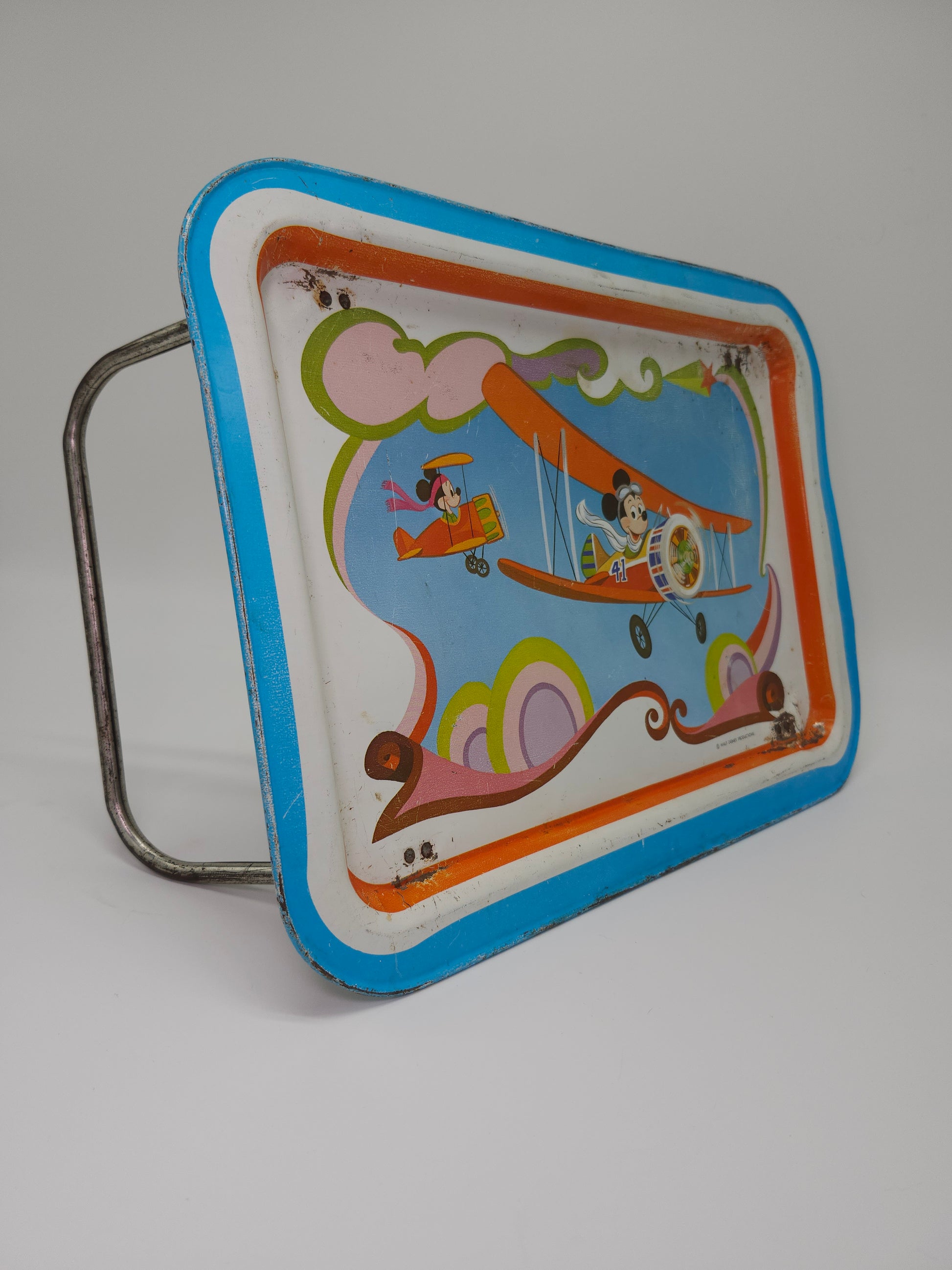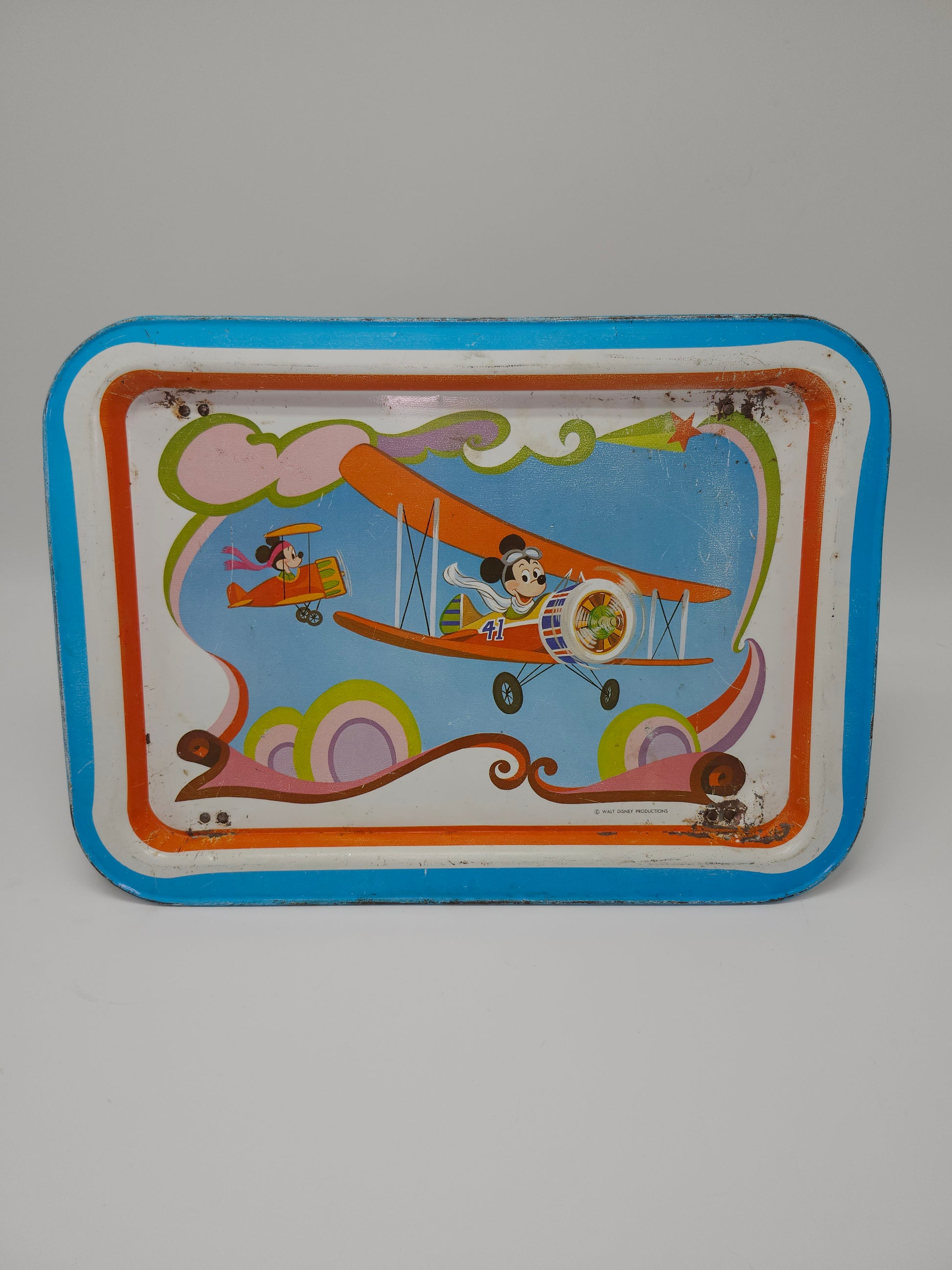 1960s DISNEY Mickey Mouse Folding Metal TV Tray featuring Mickey Mouse riding airplanes on a mixed colorway motif.