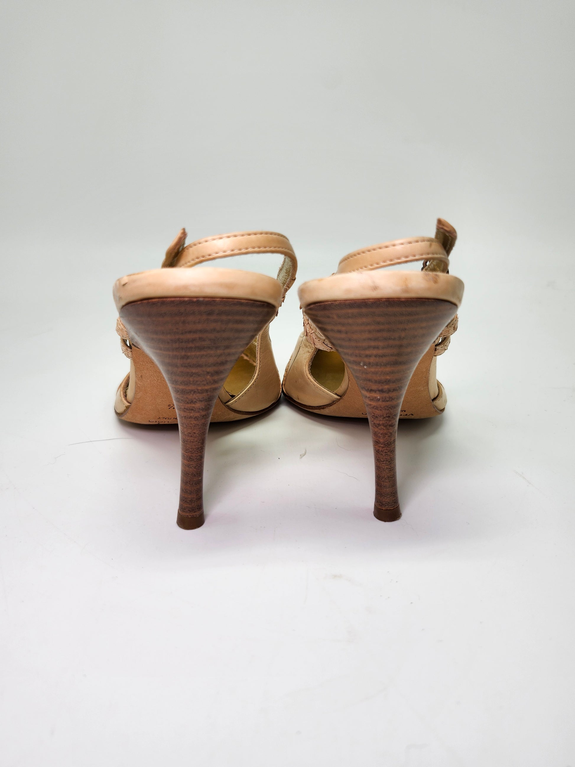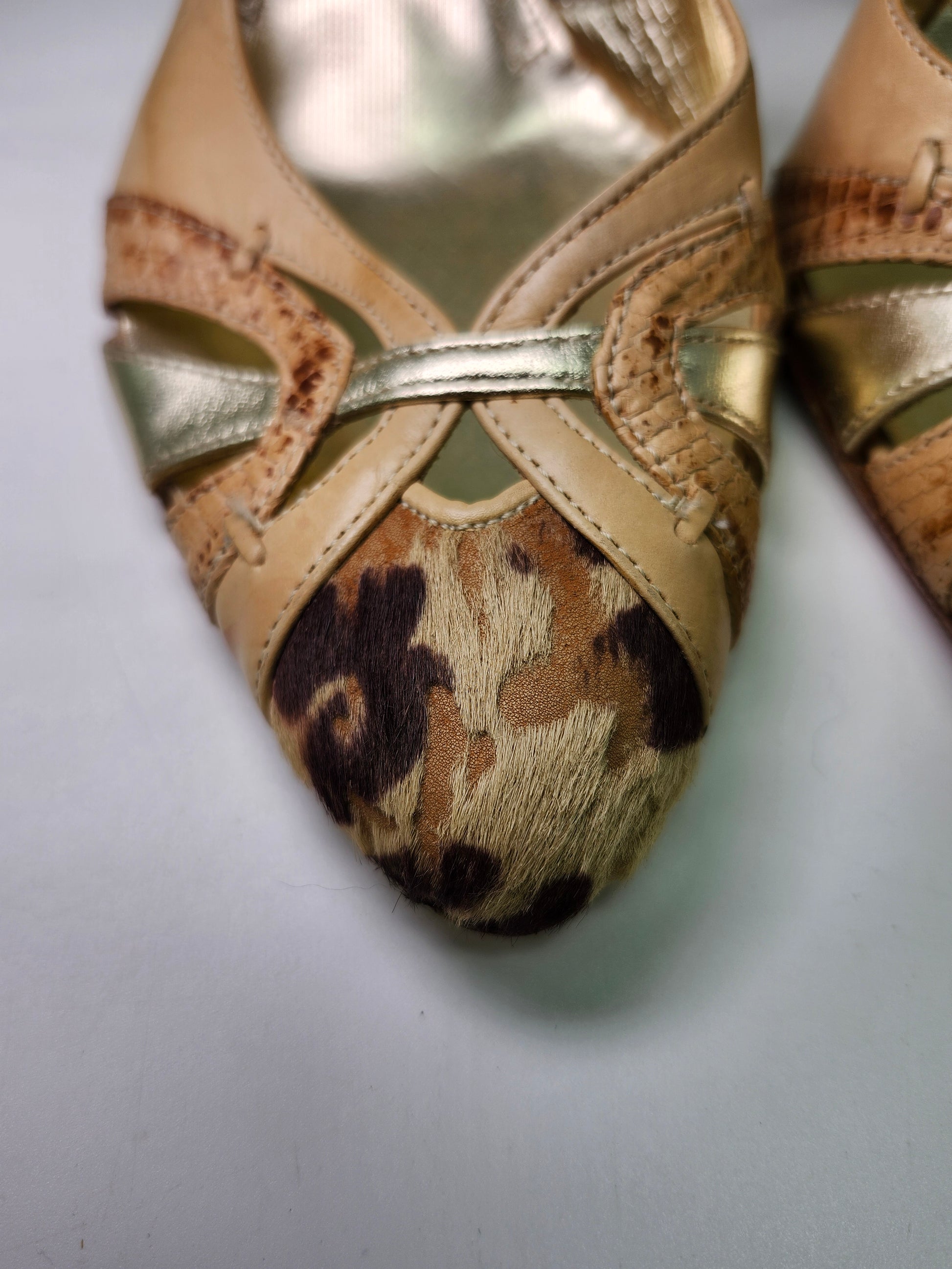 *Antonio Eboli* Y2K Beige Leather & Fur Peep Toe Sling Back Heels Women's 8.5