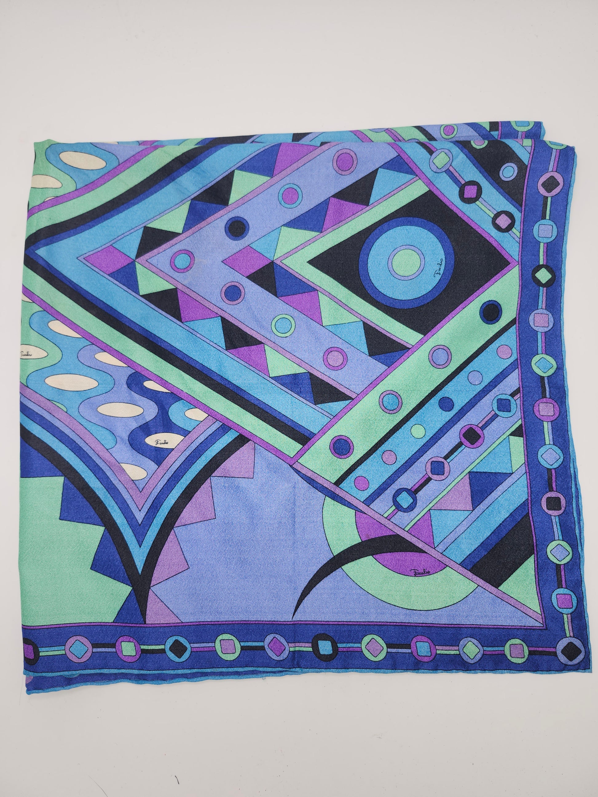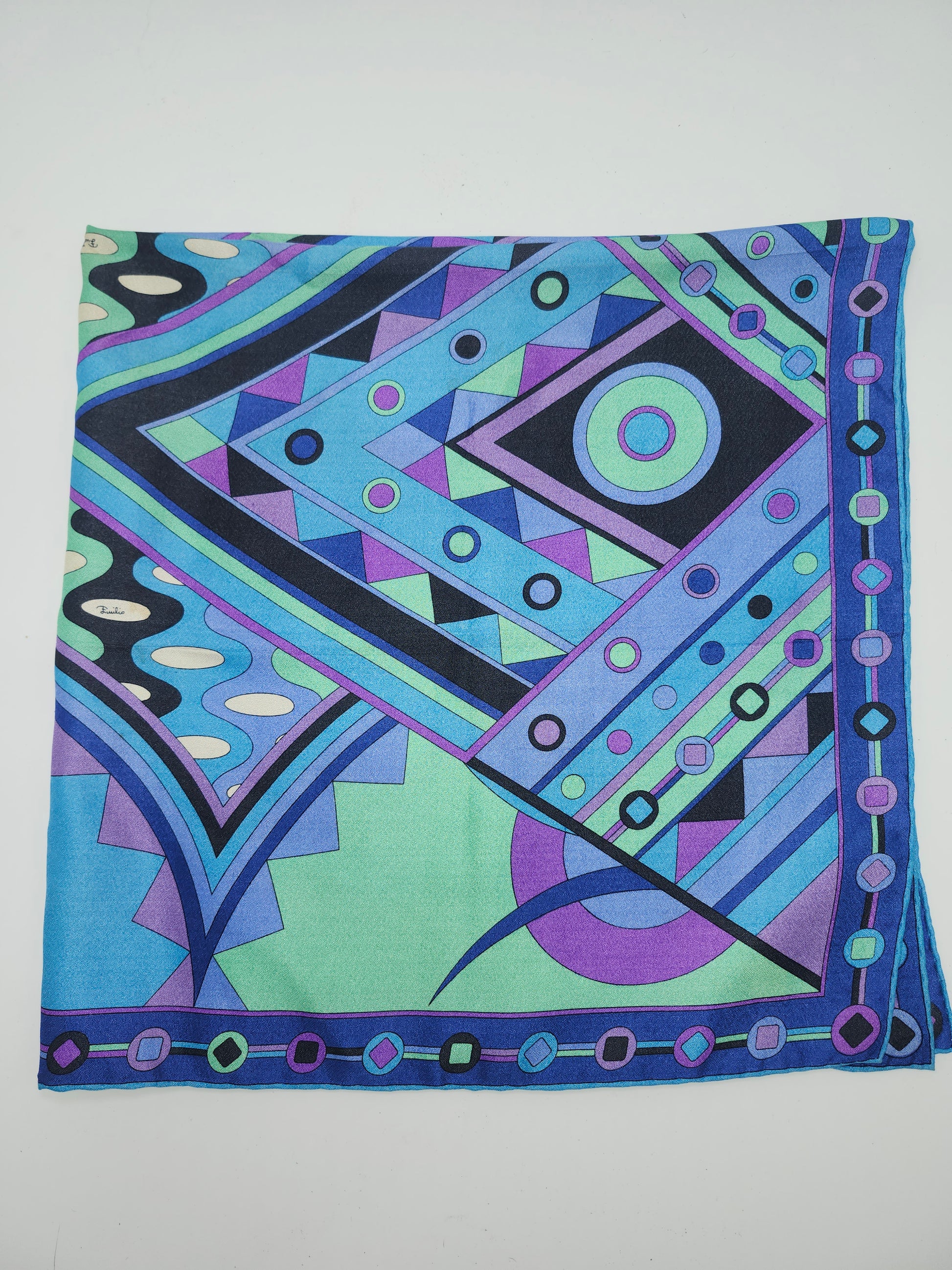 Emilio Pucci Vintage 1960's Geometric Cool Toned (various shades of blue, green & purple) XXL Silk Scarf, classic "Emilio" signature scattered throughout fabric.