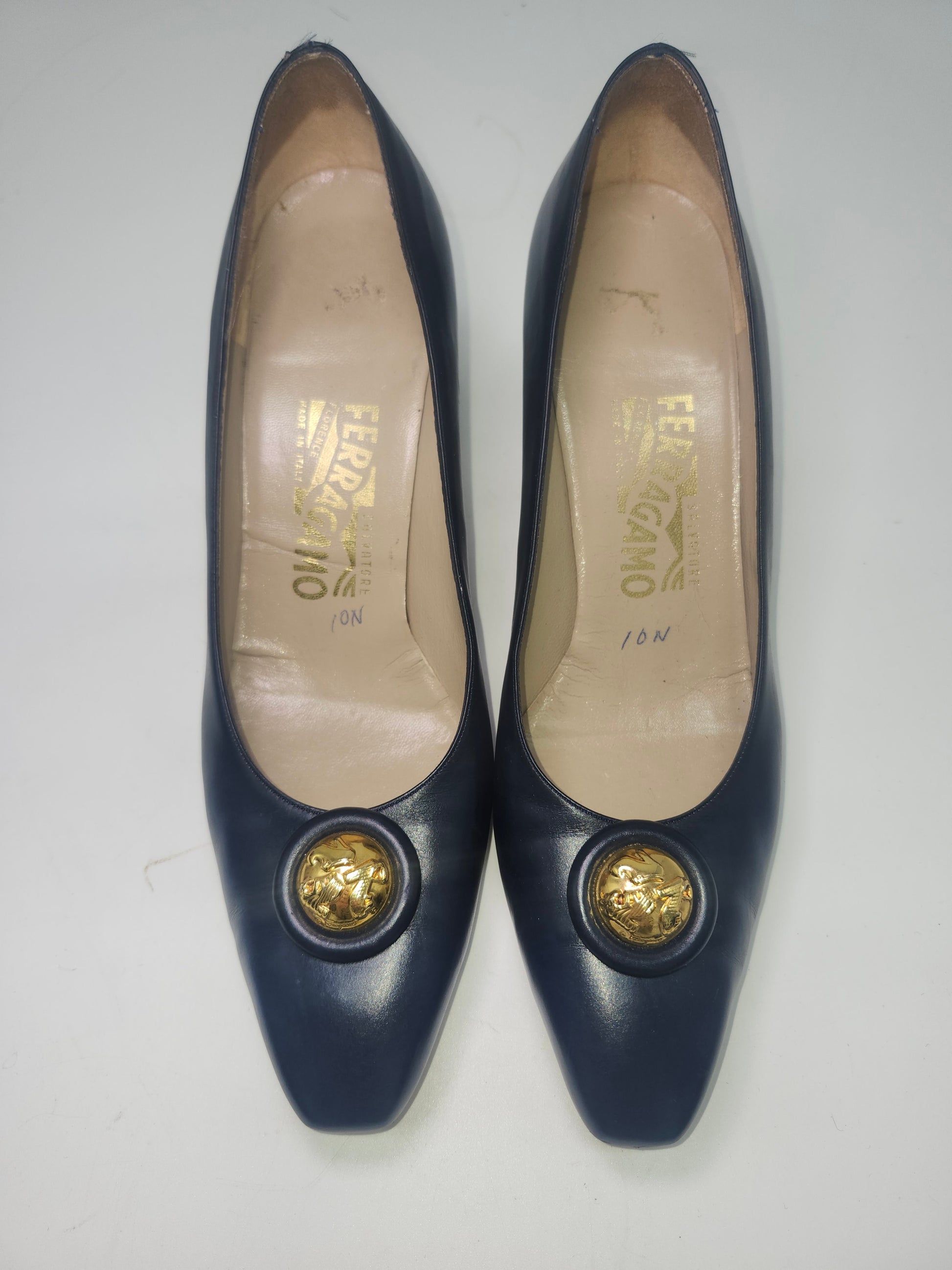 *Ferragamo* Navy Blue Leather Heels with Gold Toned Hardware, US Women's size 10N (Narrow)