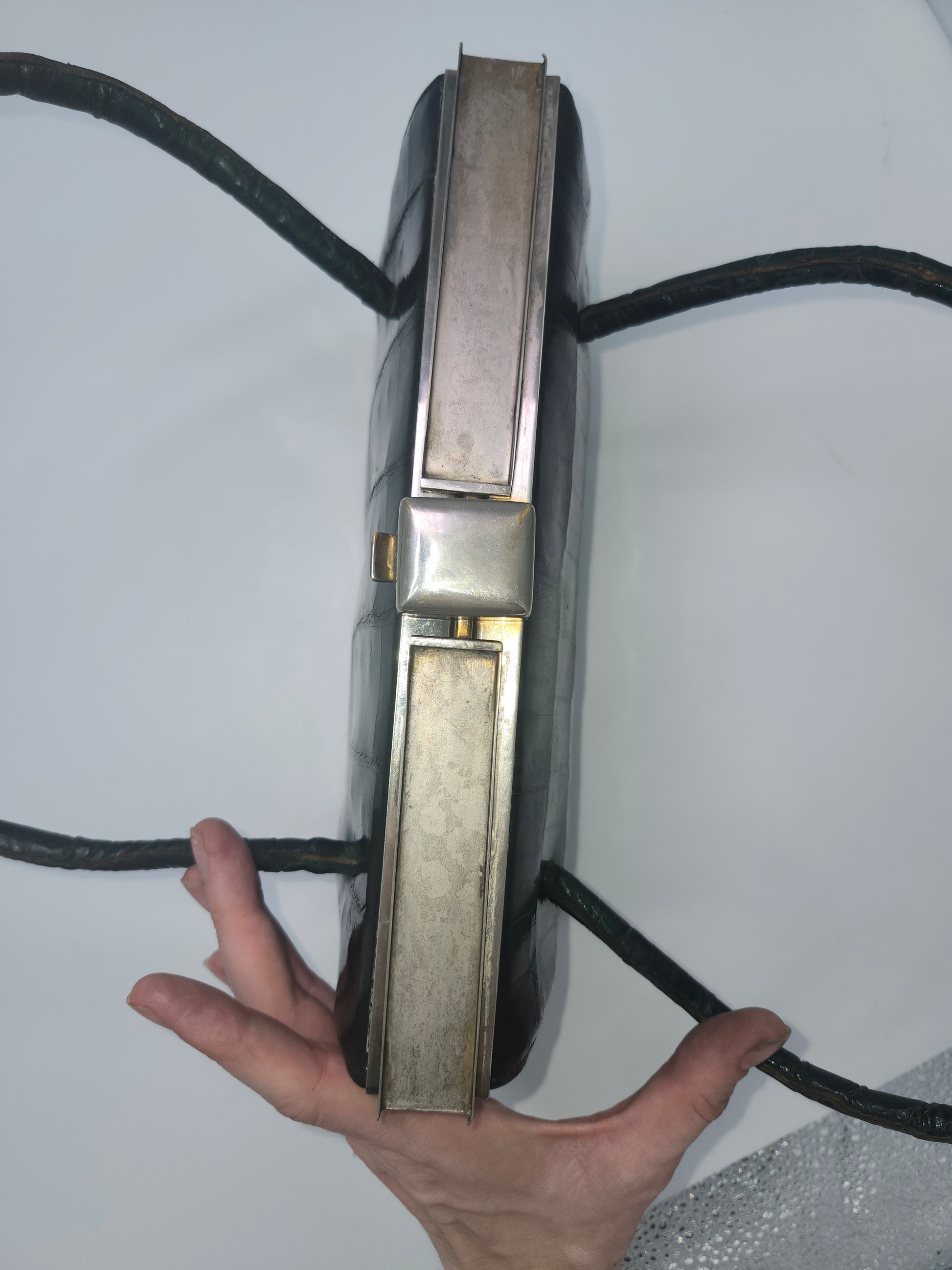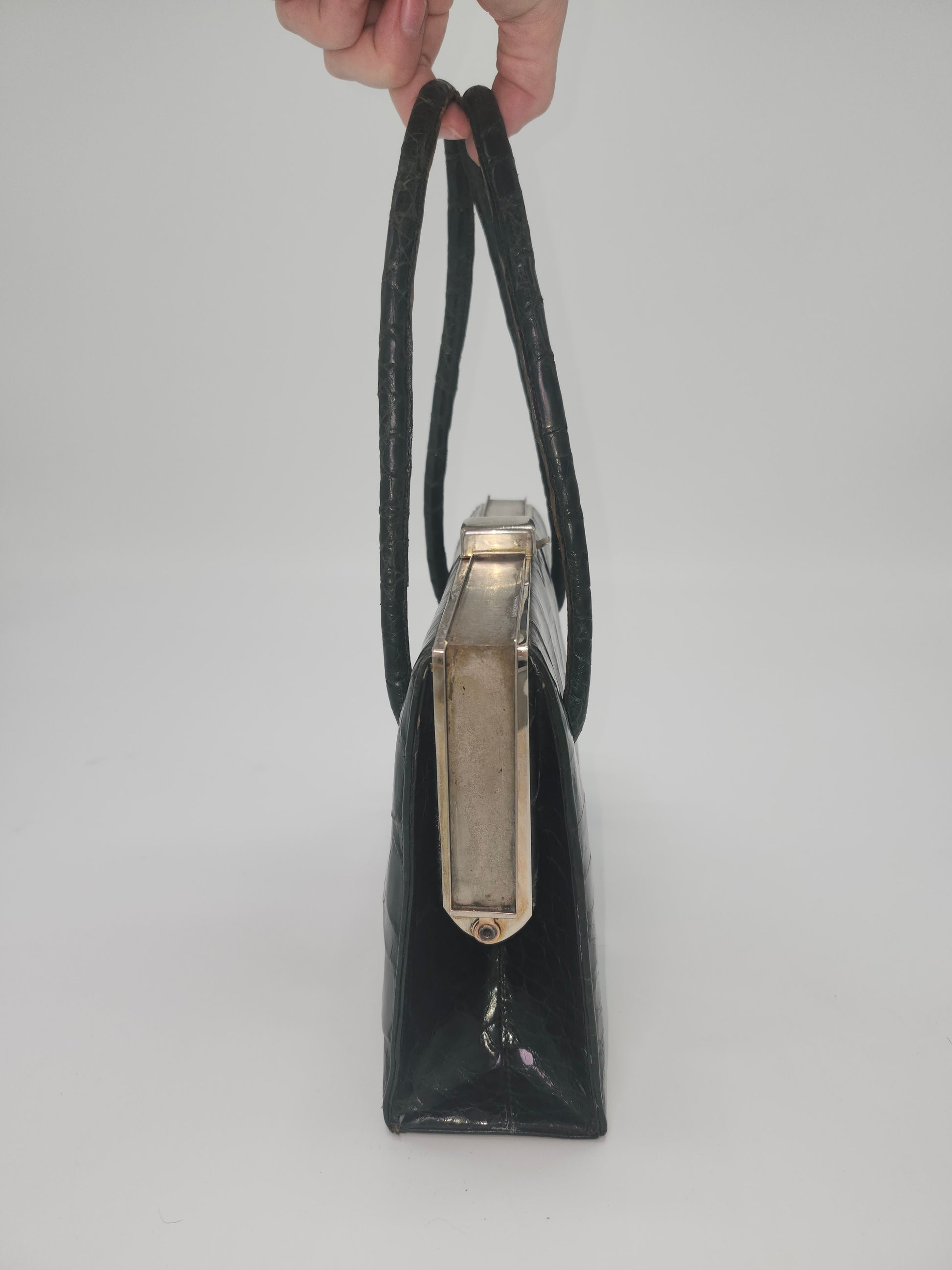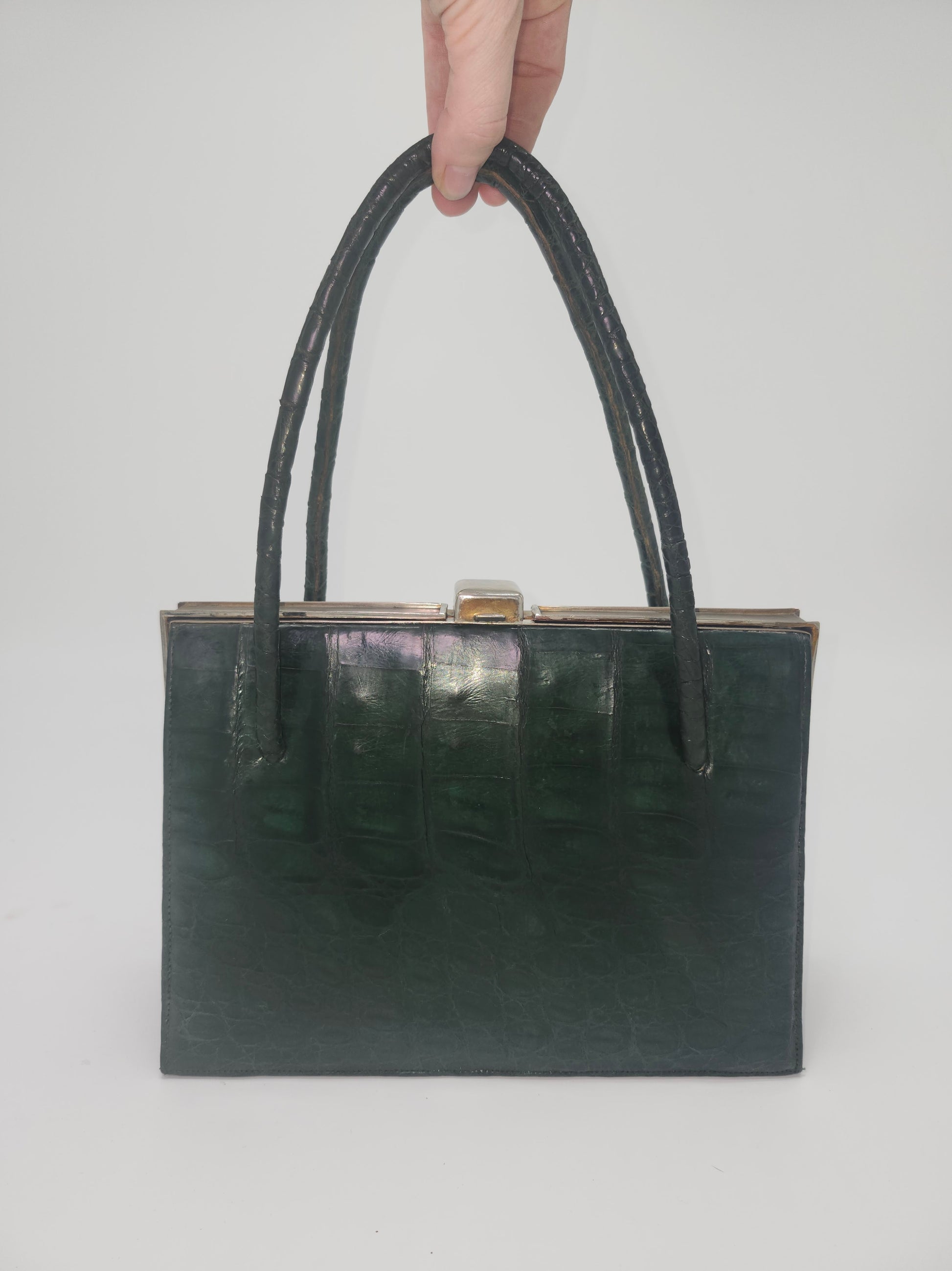 Mid Century Green Caiman Crocodile Leather Purse, suede interior lining, made in Argentina, top-flip closure with metal hardware, interior pockets for additional storage.