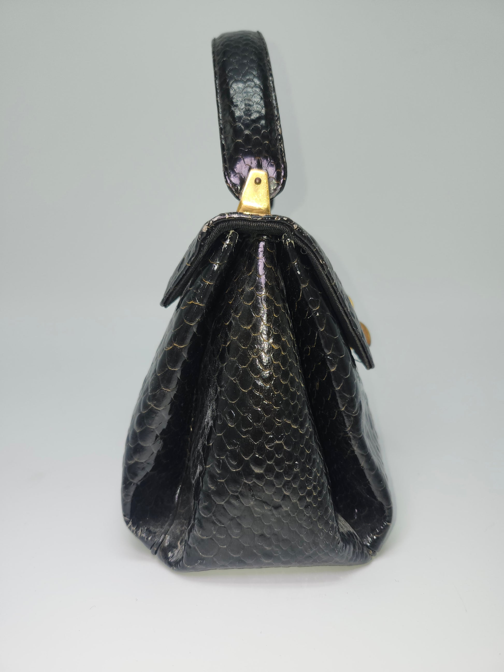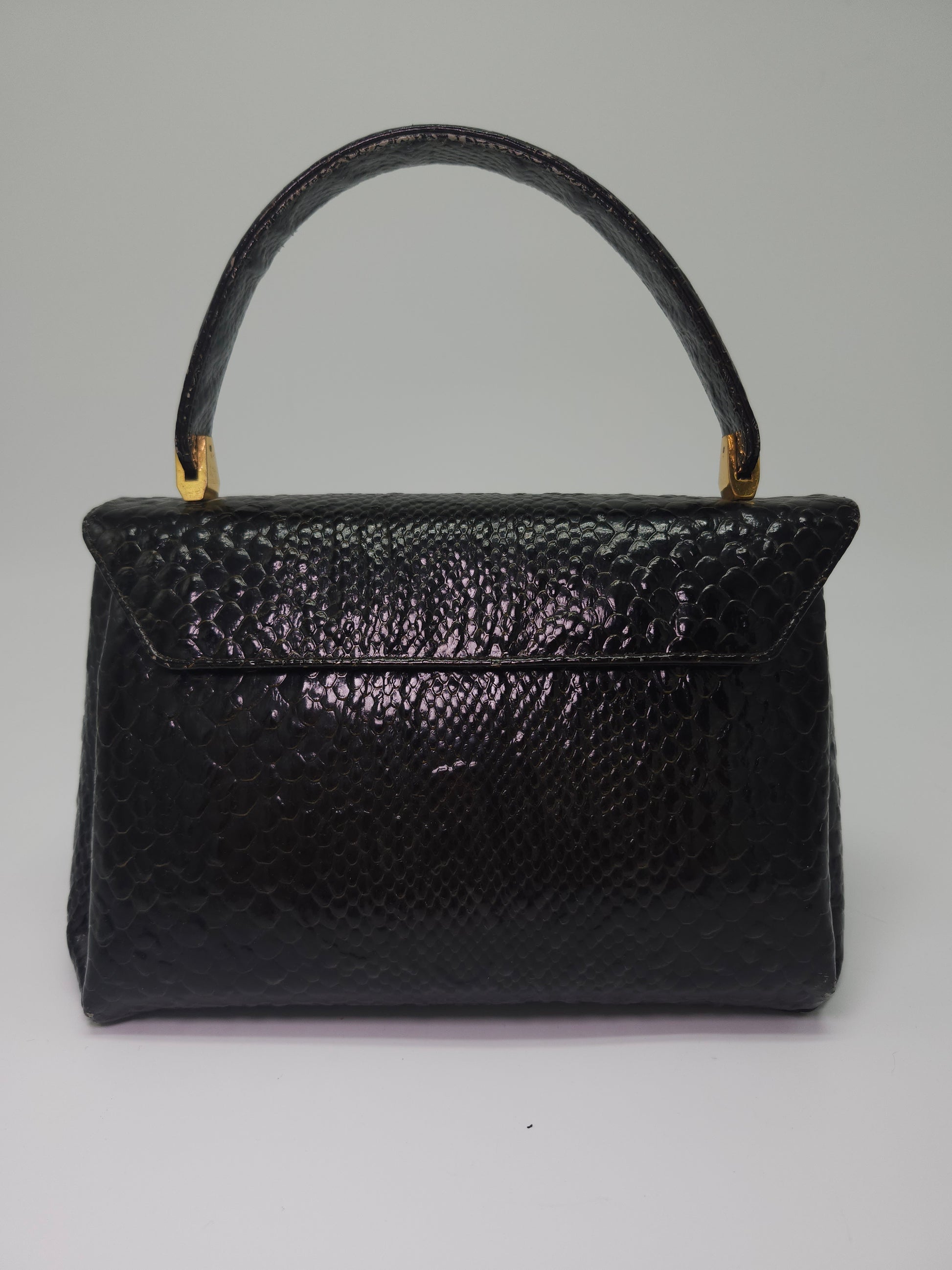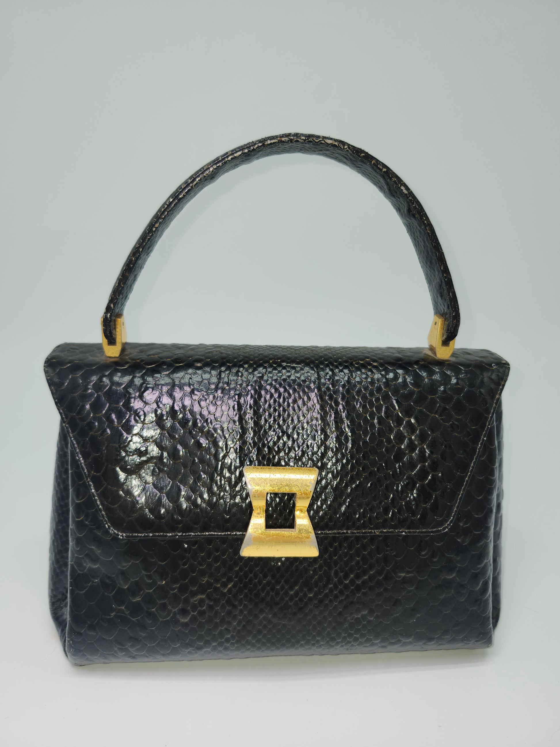 Mid Century Python Style Embossed Leather, all brass hardware, dual fold interior with one extra pocket for storage, top handle mini purse.