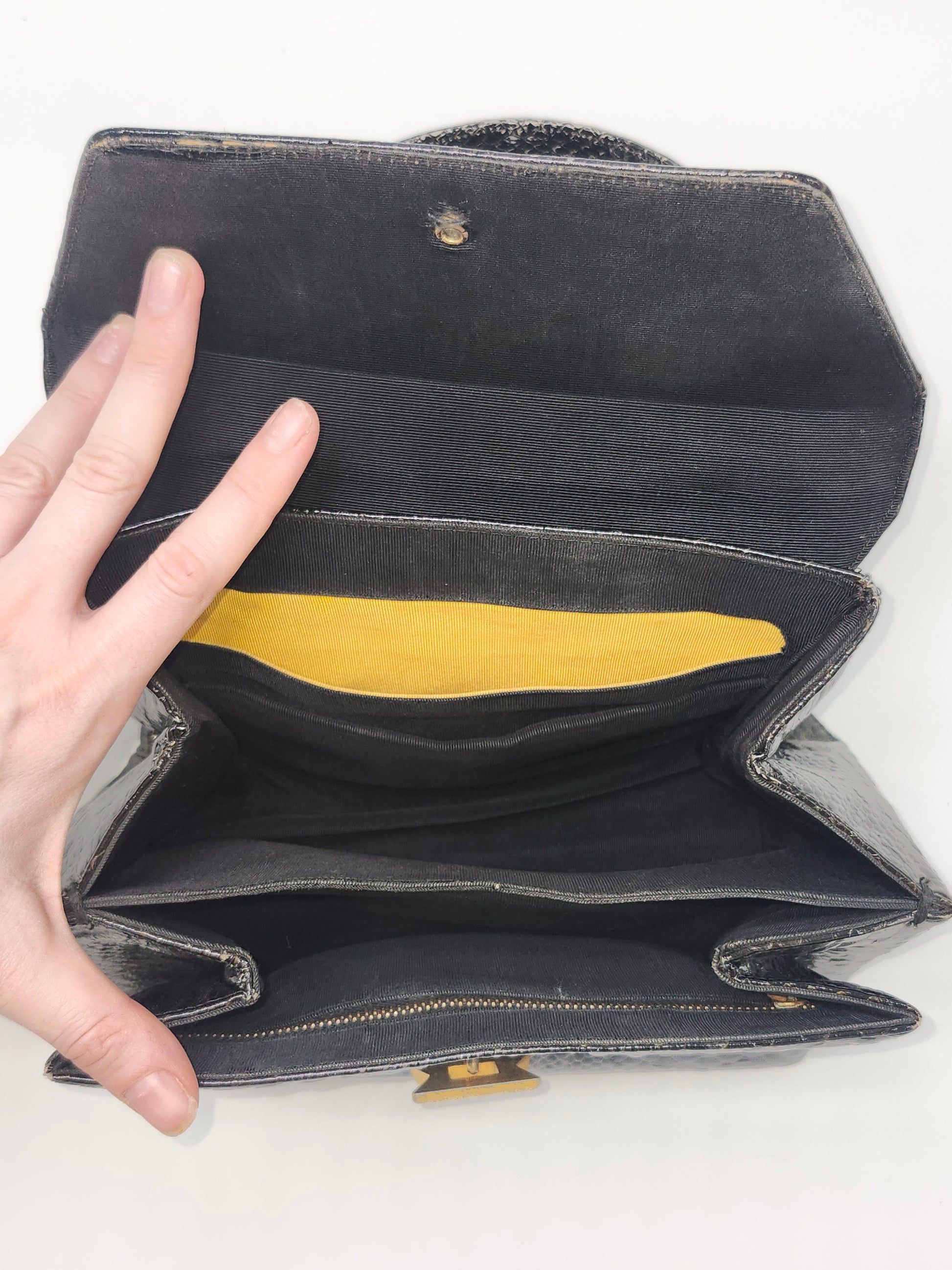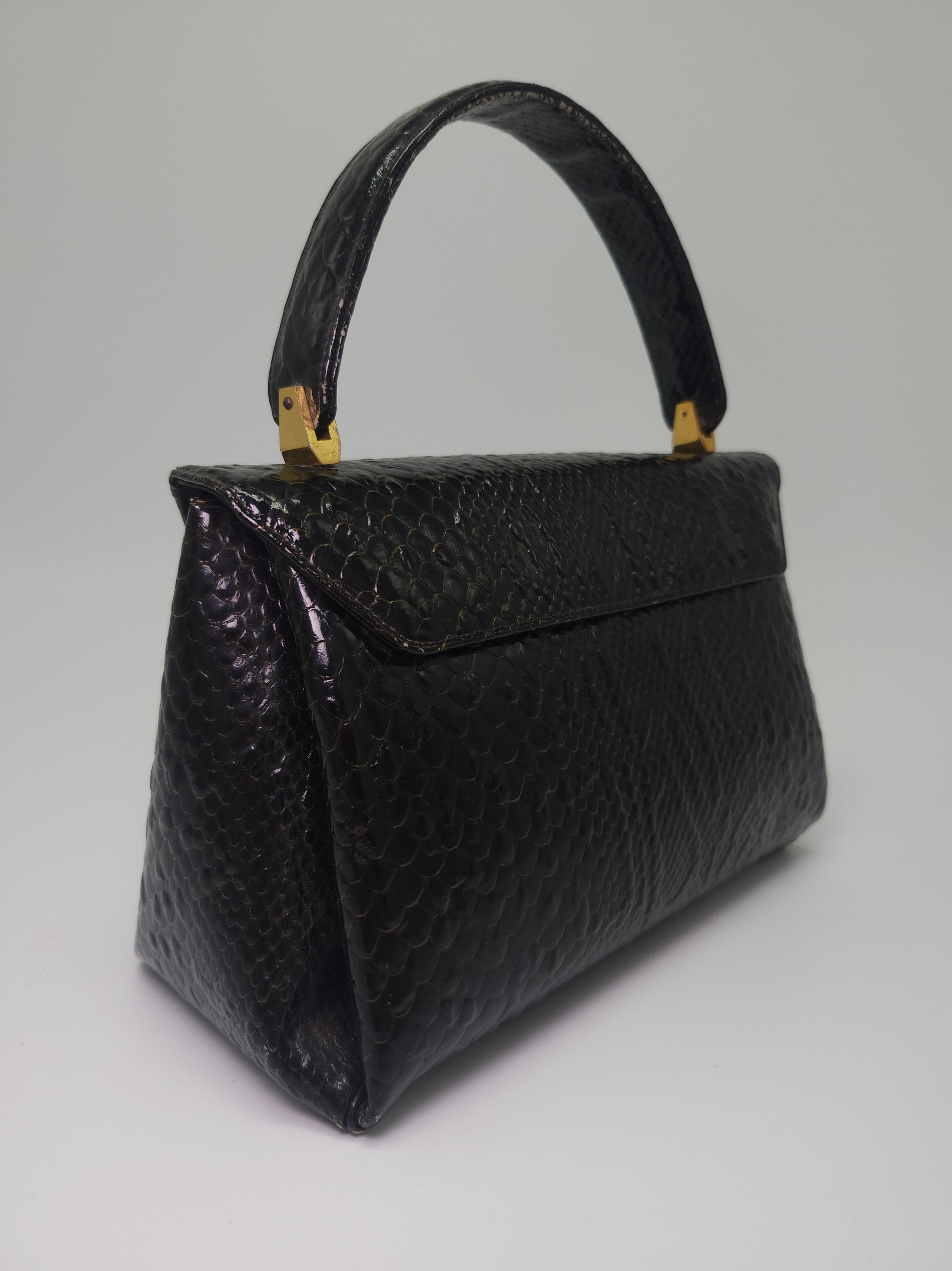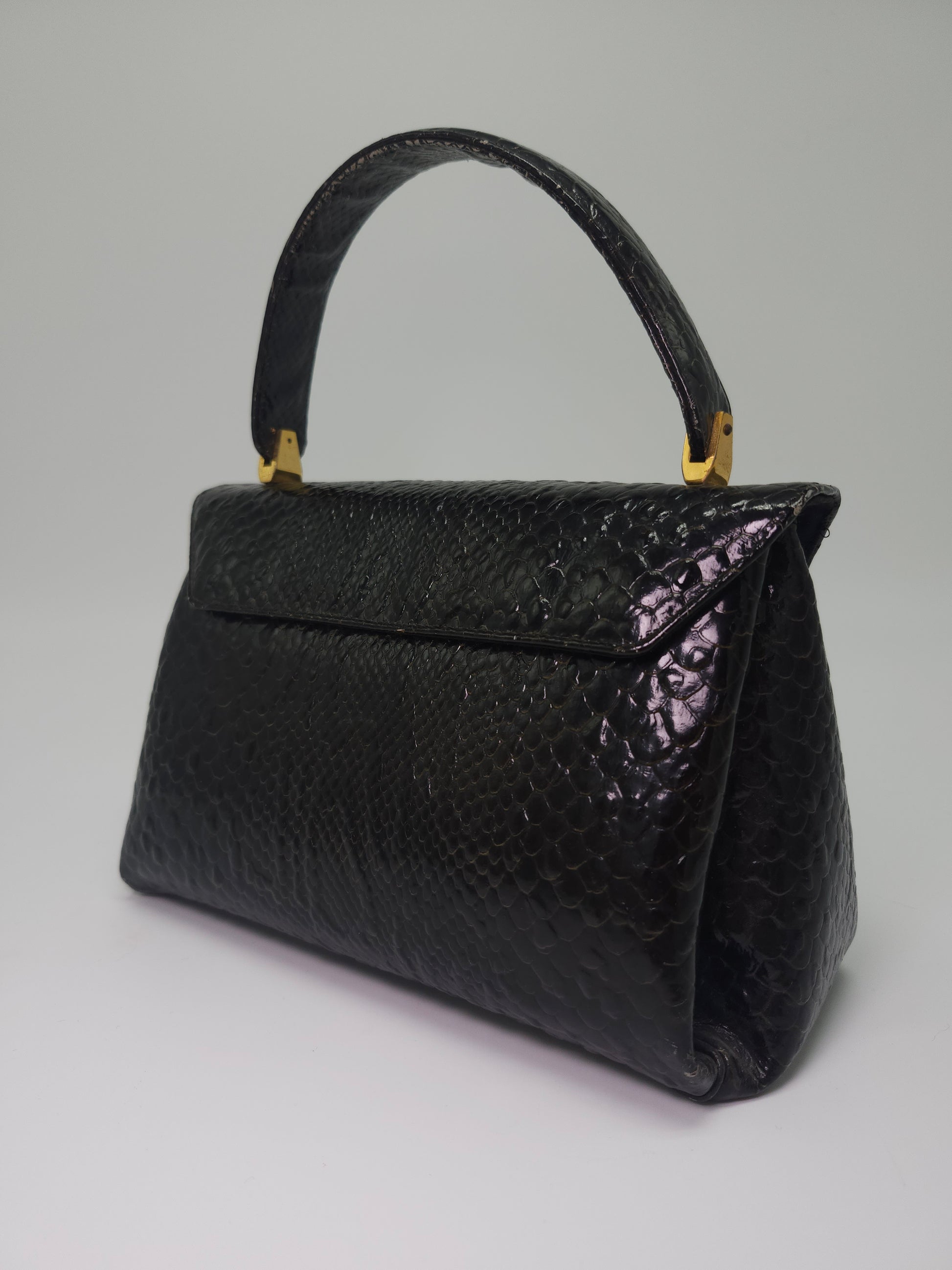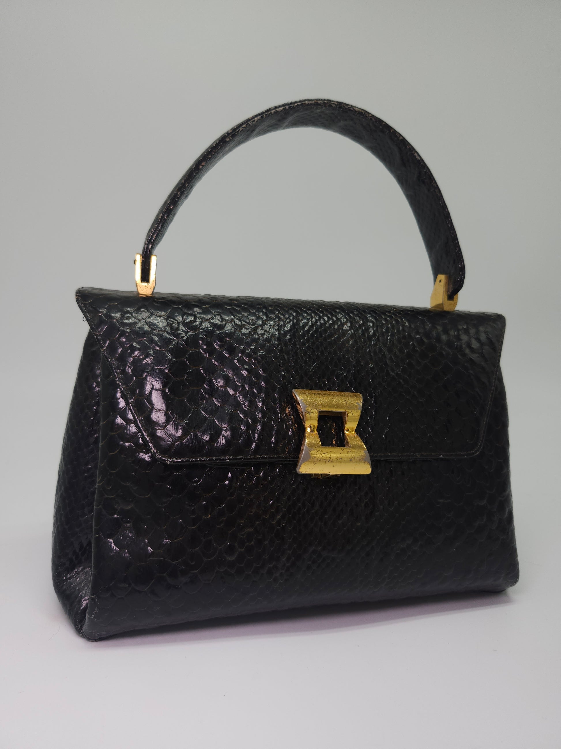 Mid Century Python Style Embossed Leather, all brass hardware, dual fold interior with one extra pocket for storage, top handle mini purse.