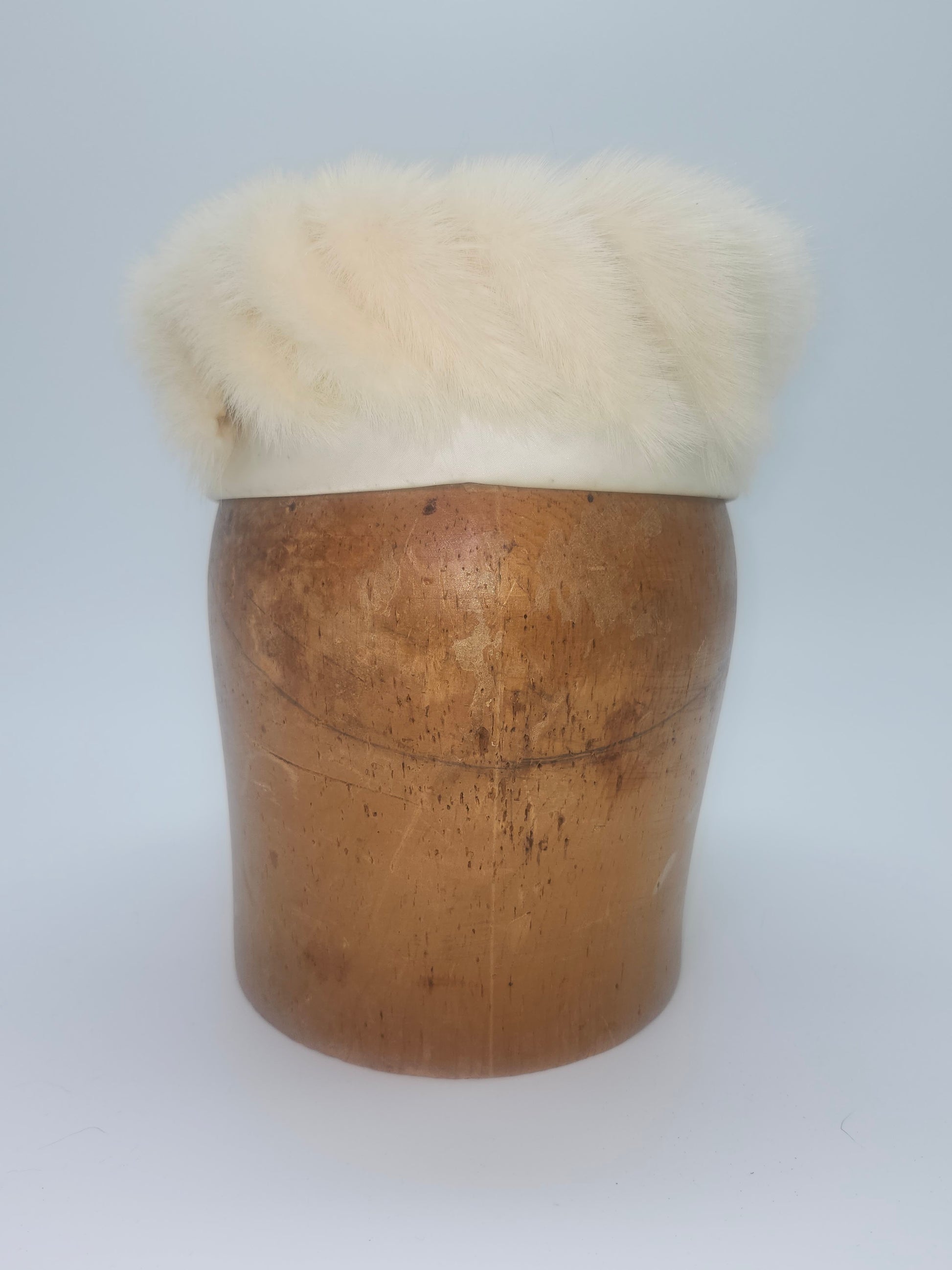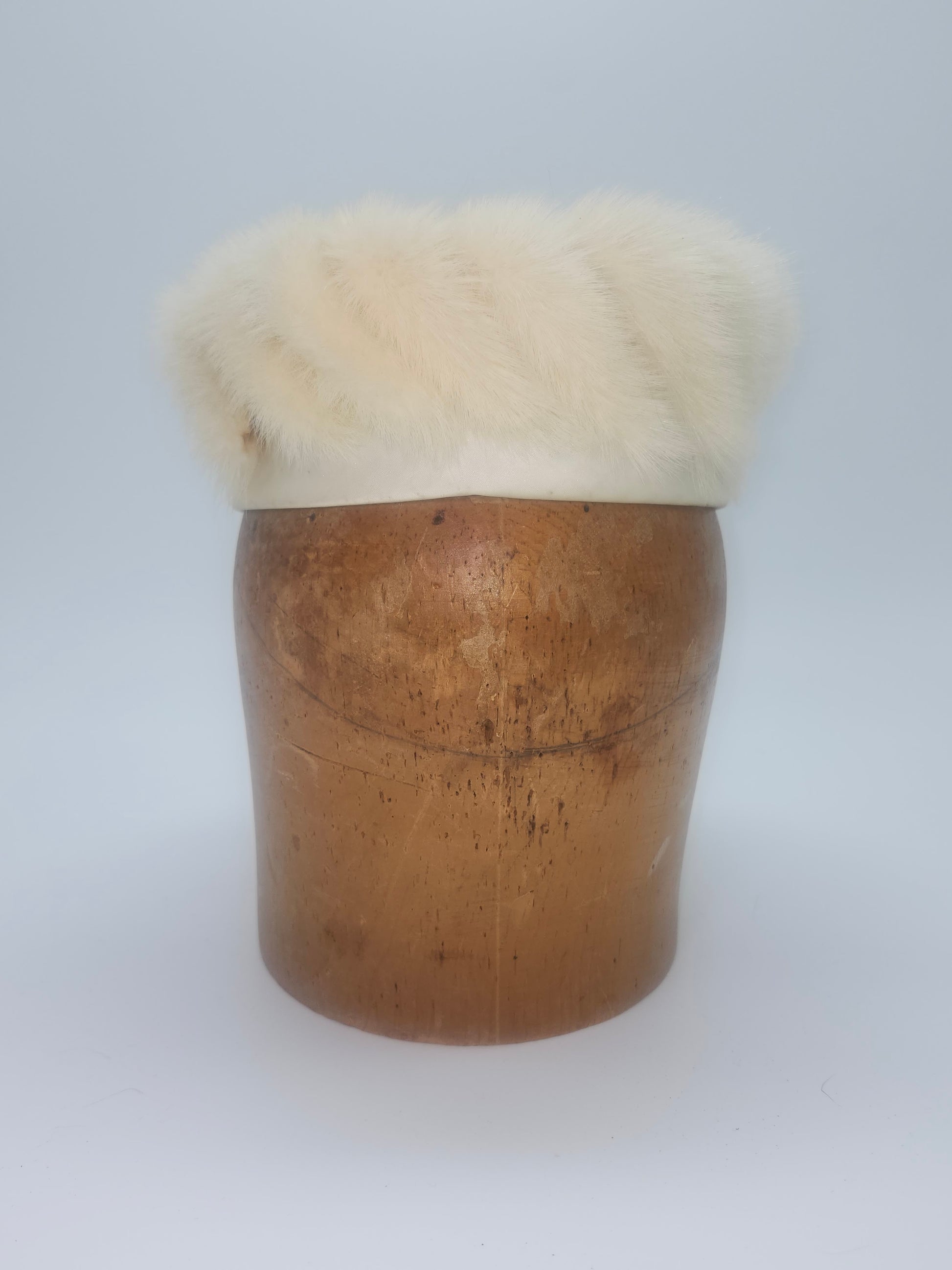 Immaculate mid-century white fox fur lined pill box shaped hat, an Evelyn Varon exclusive design.