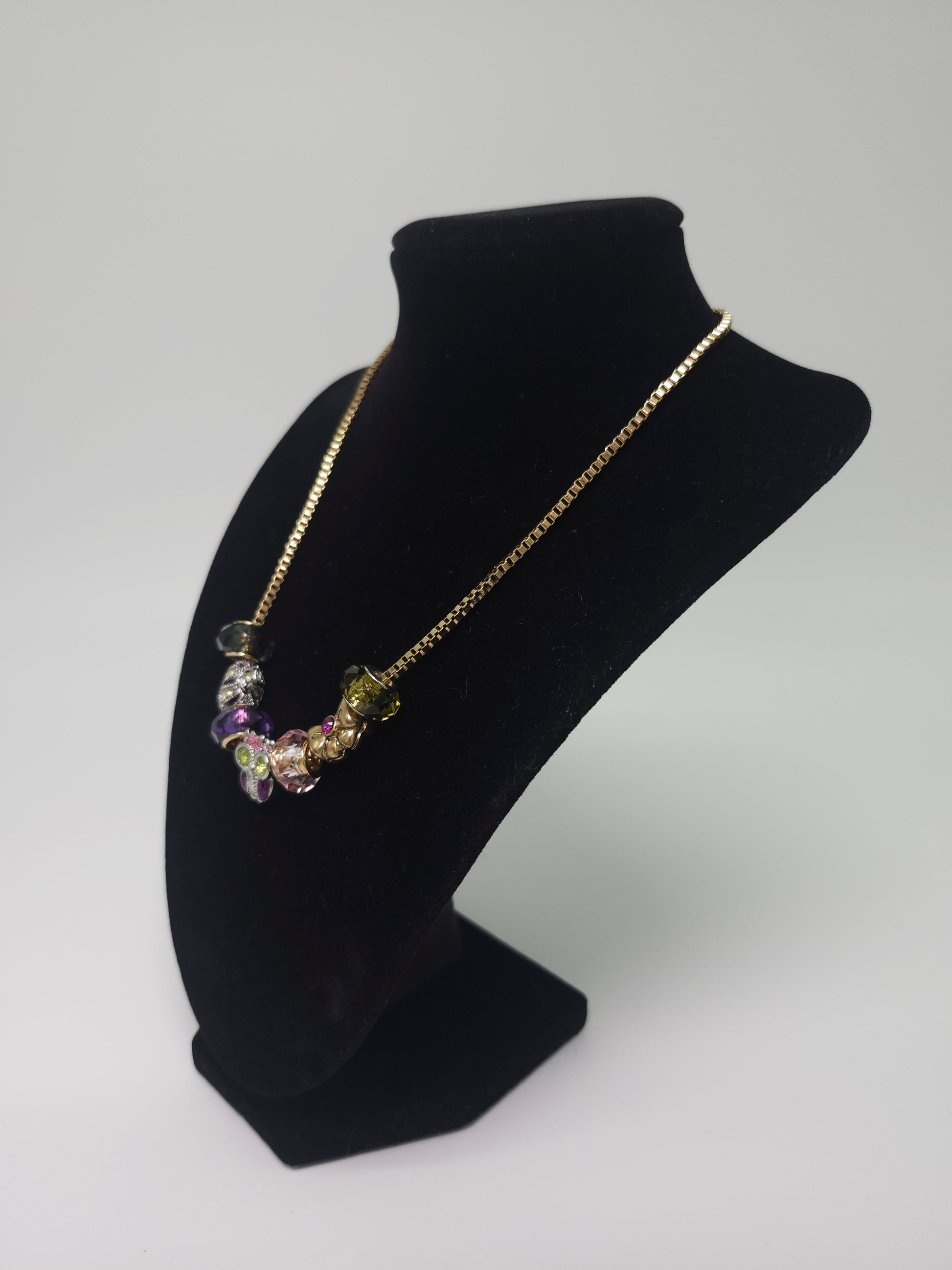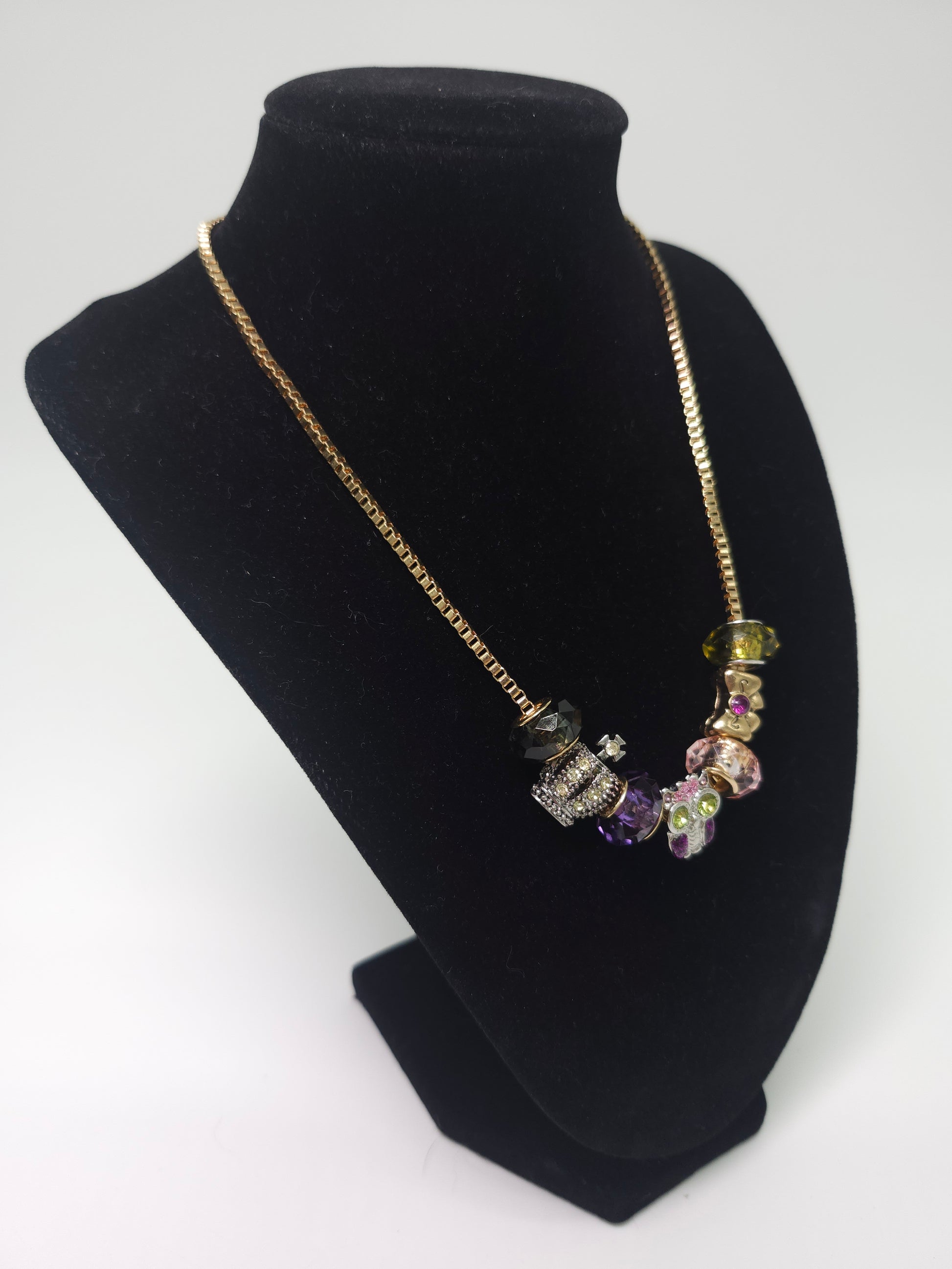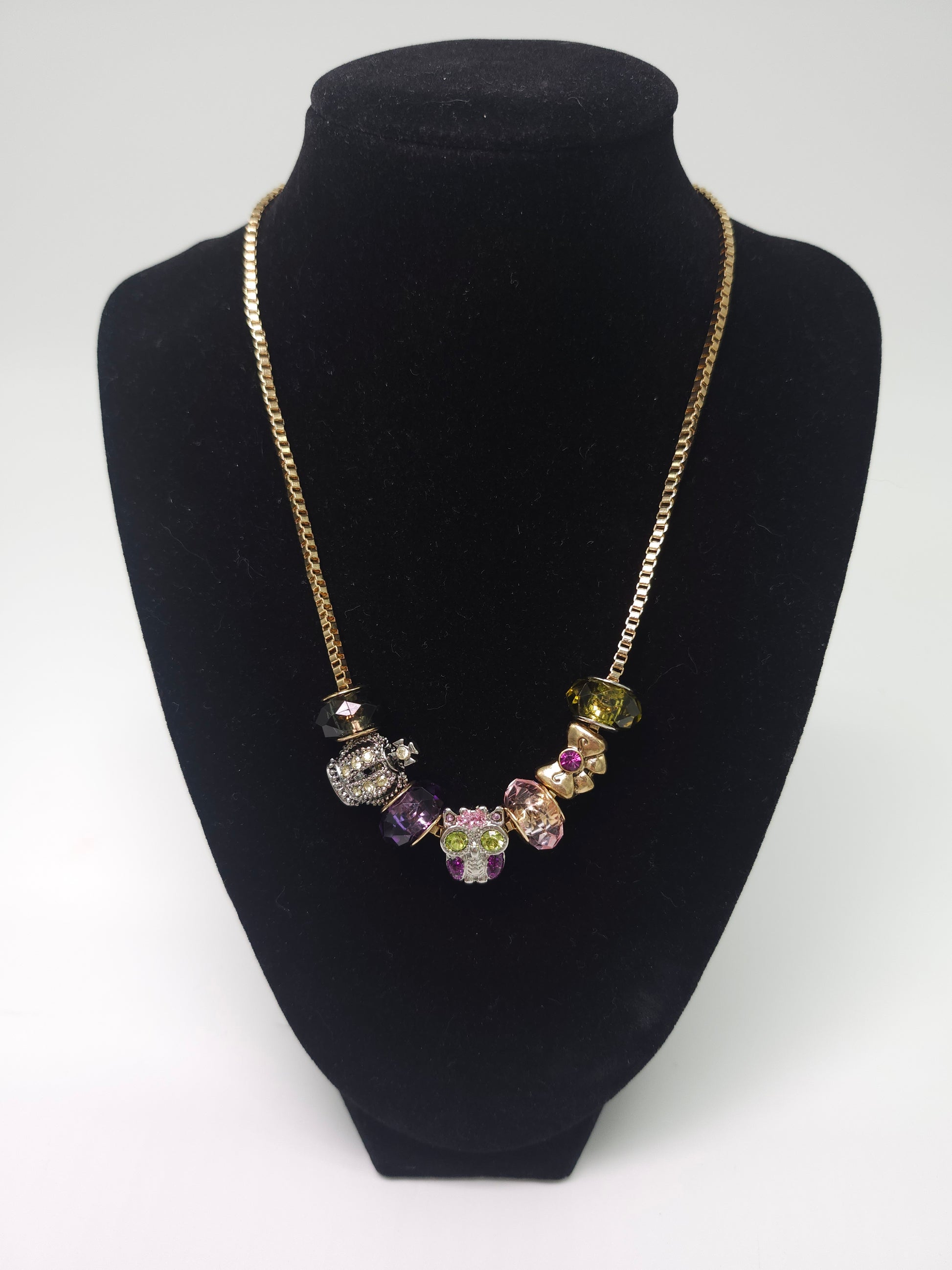 Vintage Betsy Johnson Statement Charm Necklace, charms are a bejeweled crown, an owl and a bow, gold-toned chain, adjustable length, green & purple glass beads.