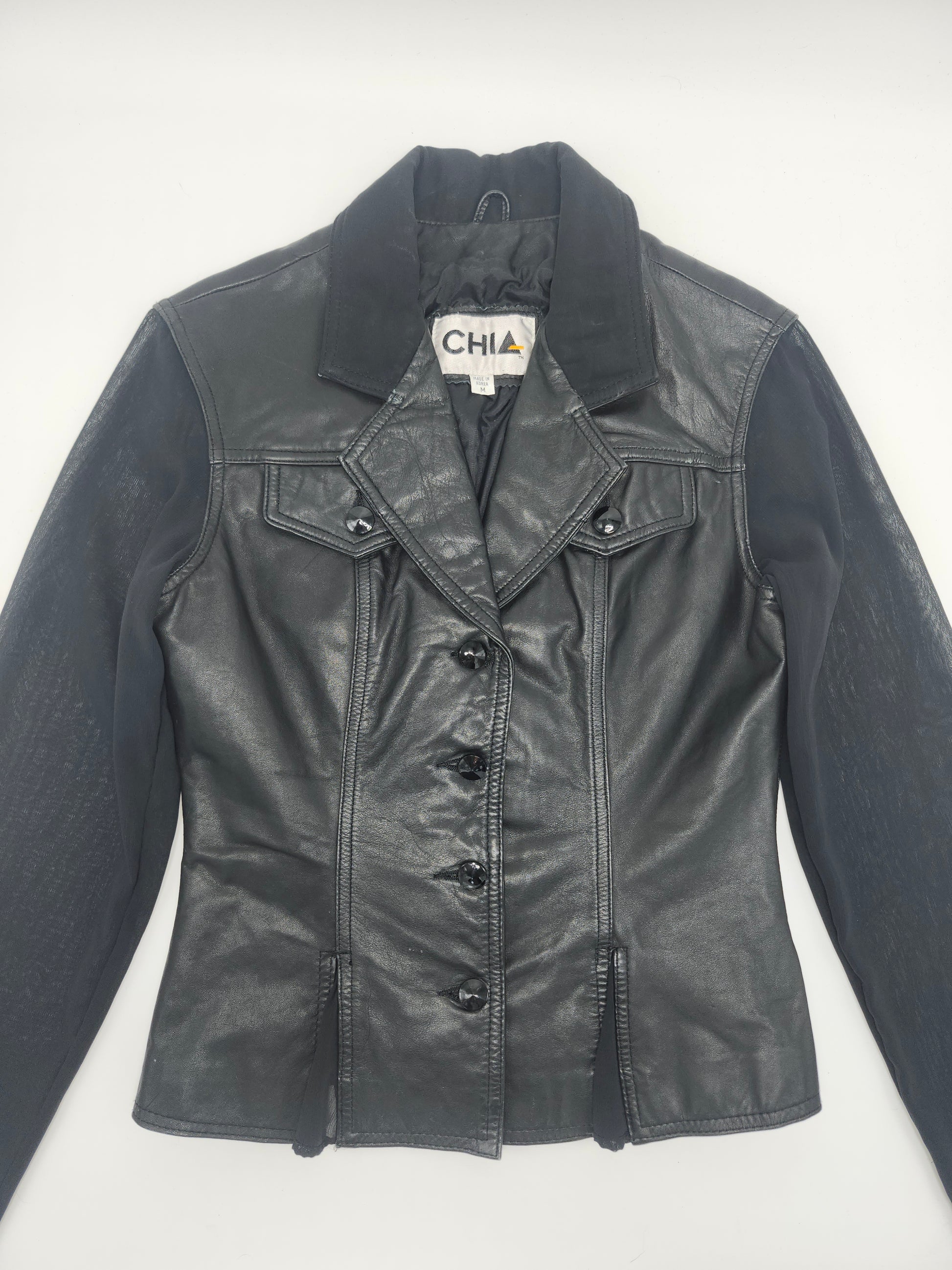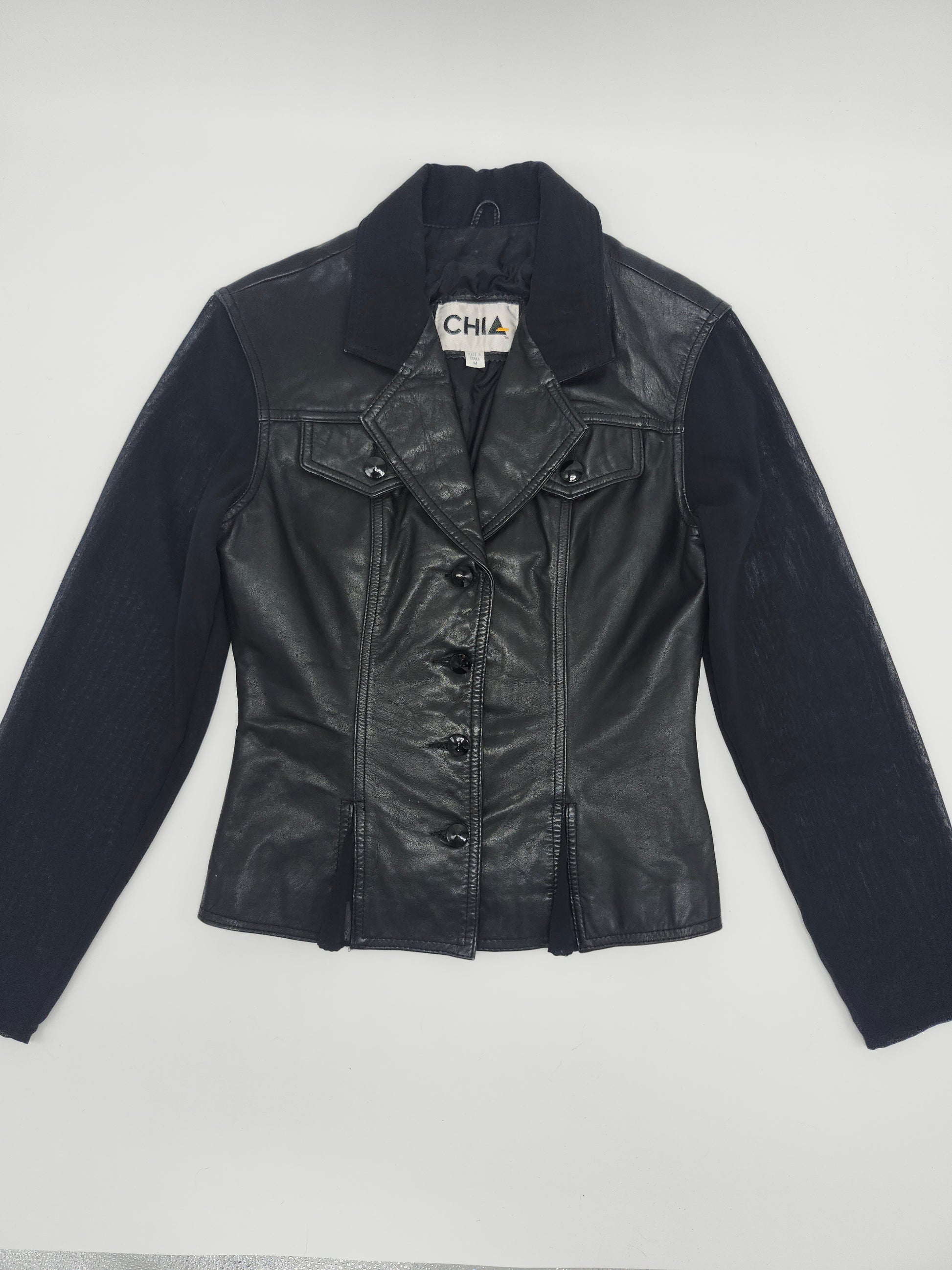 Vintage Black Leather Moto Jacket, with sheer sleeves, collar & pleat details, front breast pocket flaps, 4 button up front closure. Made by the brand Chia in Korea.