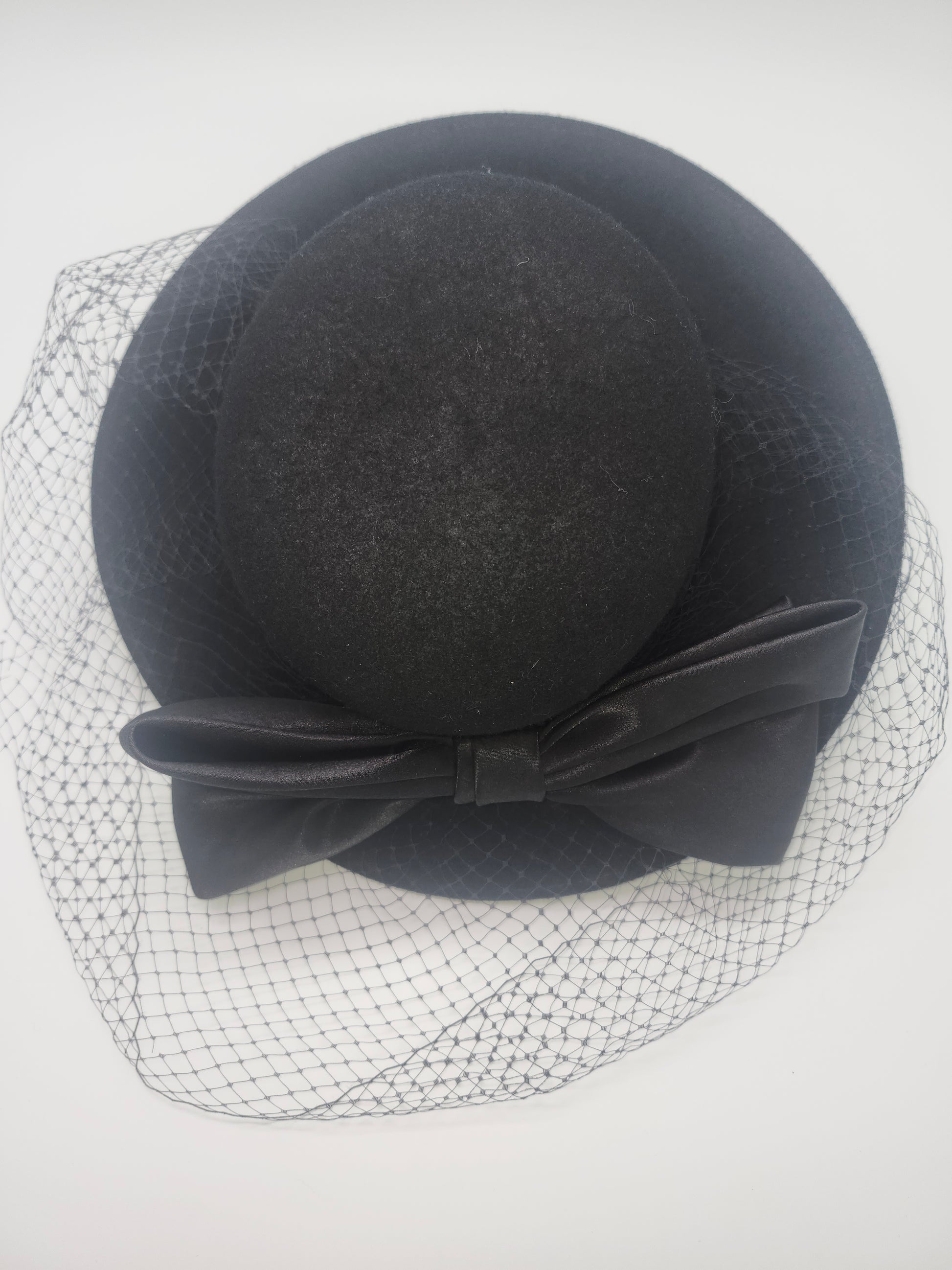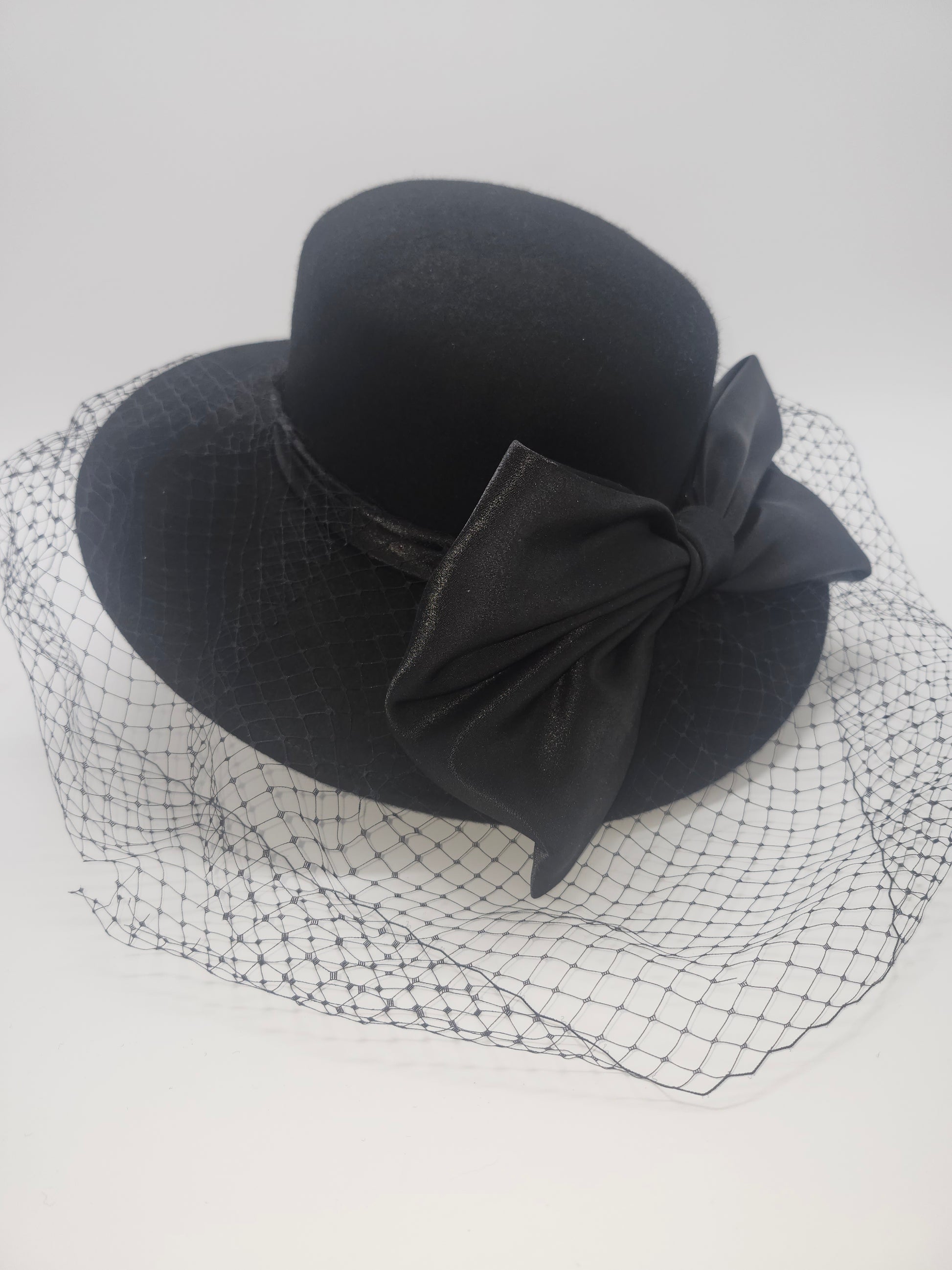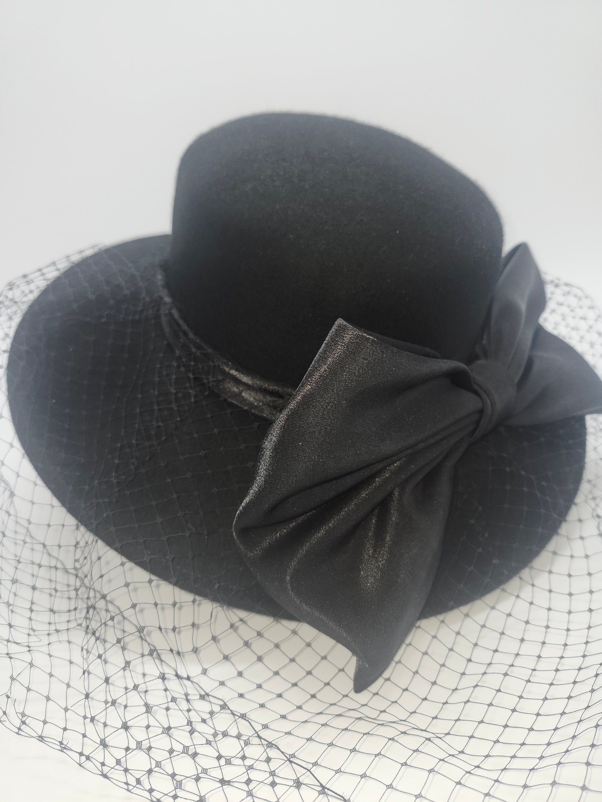 Vintage Black Wool Wide Brim Hat with Satin Bow & Black Netting