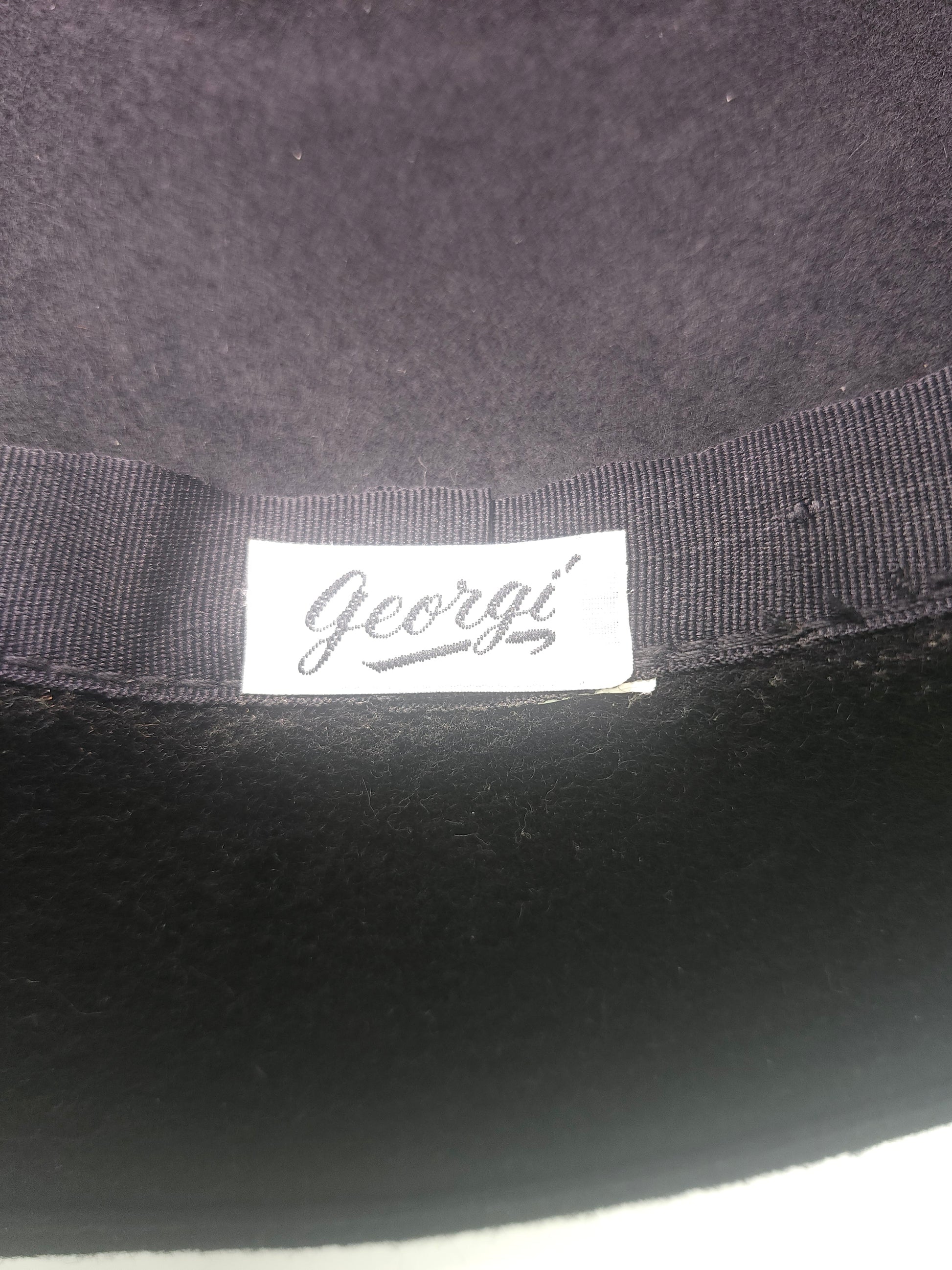 Vintage black wool wide brimmed hat with black satin sash with a large bow in the back center, and black netting draped around the front half of the hat, made by brand Georgi.