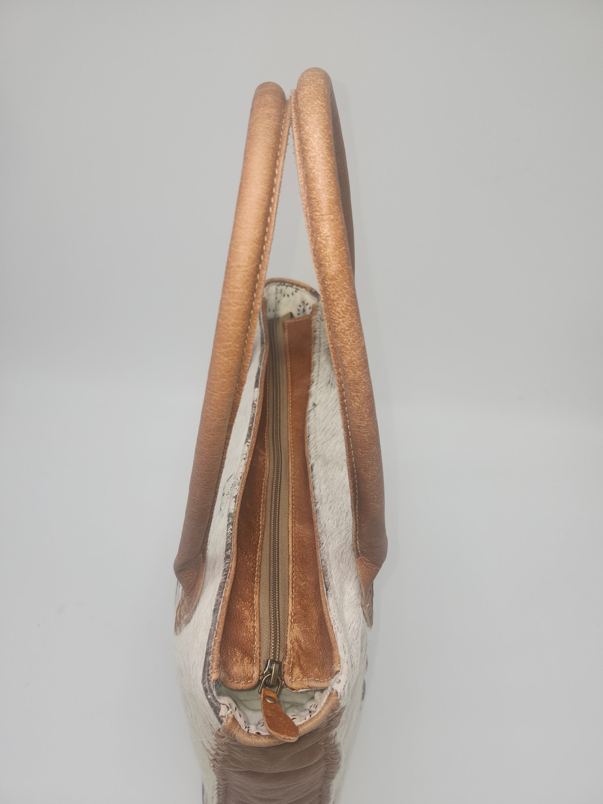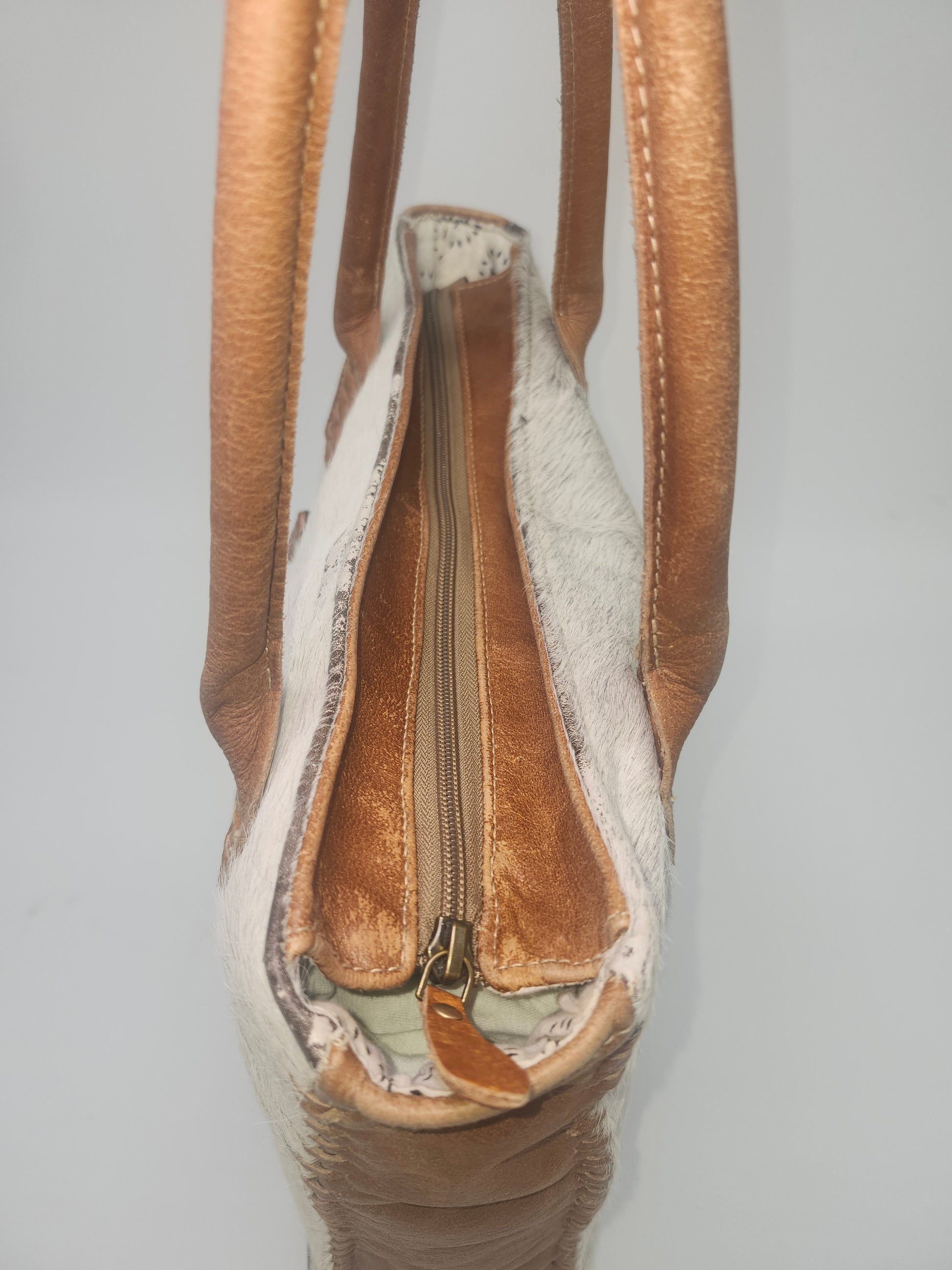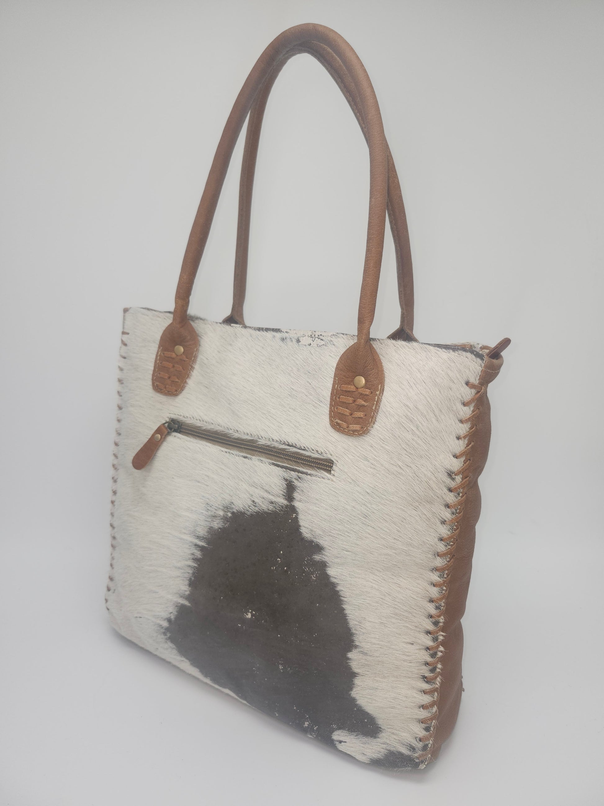 Vintage Black & White Cowhide with Leather accent Tote Bag, 3 interior pockets for storage, one exterior pocket for additional storage, made by brand Myra Bag.
