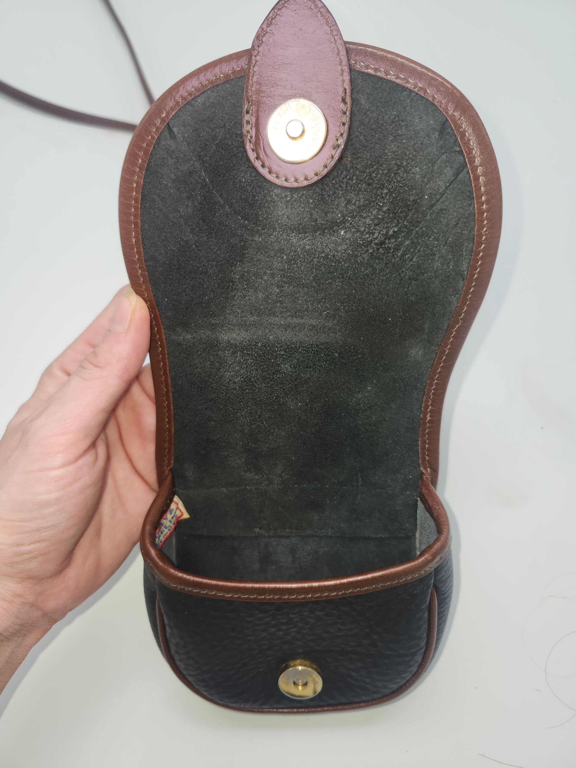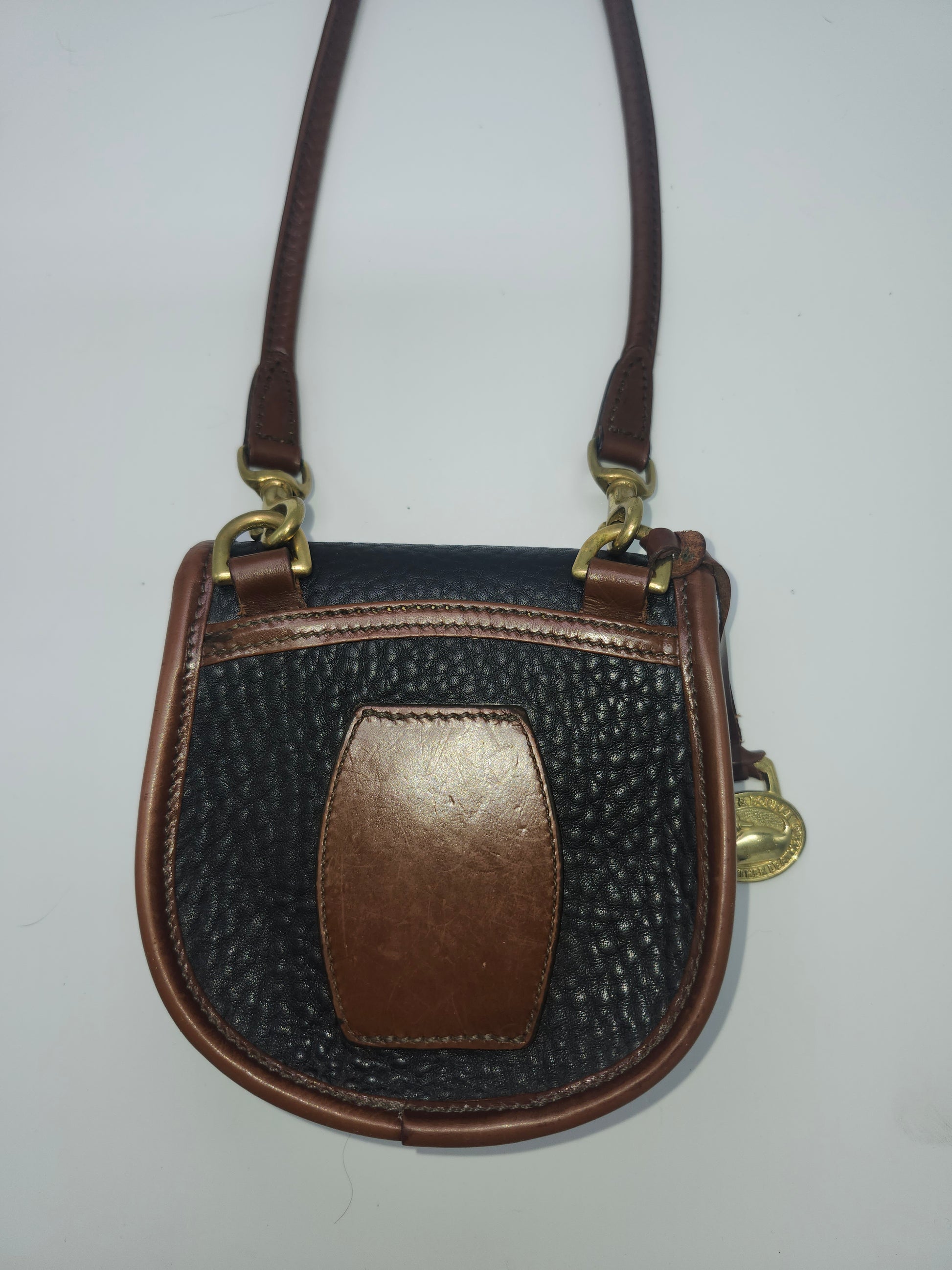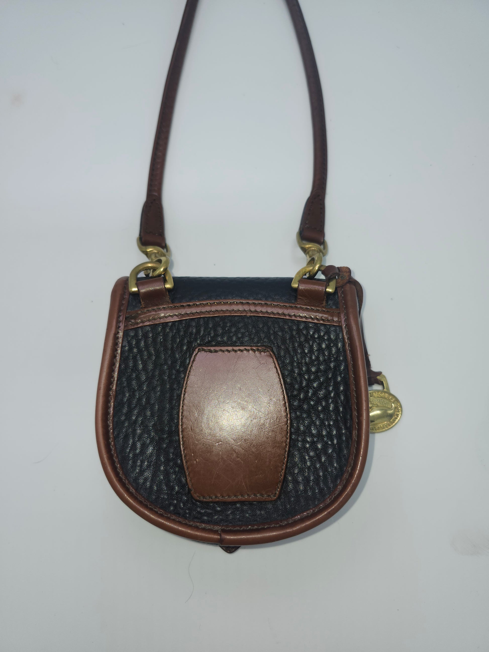 Vintage Dooney & Bourke dual toned, brown & black pebble grain leather cross body mini purse.