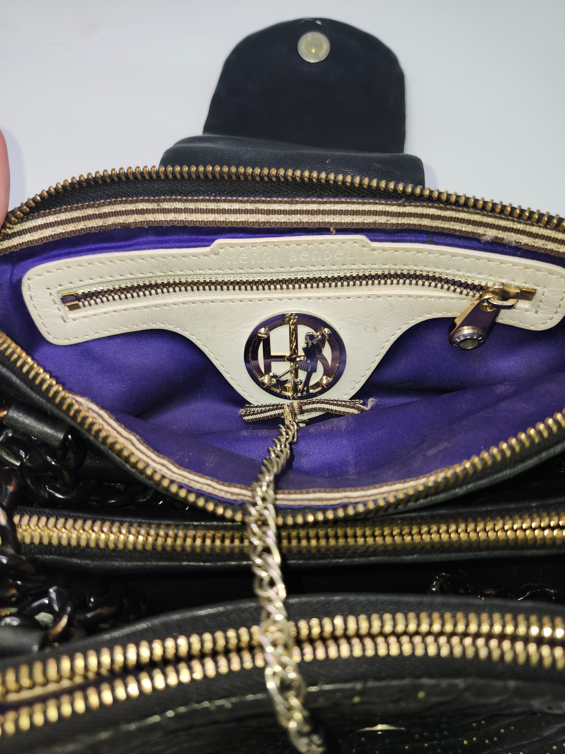 Y2K Henri Bendel Quilted Black Leather Purse, heavy gold toned hardware, black enamel chain straps (can be used singularly as a cross body or doubled up as shoulder straps, top flip closure with magnetic hardware, 3 interior pockets with zipper closures, another 2 interior pockets folded between the prior 3 without zippers, for a total of 5 storage pockets, chain strap attached fold out compact mirror included.
