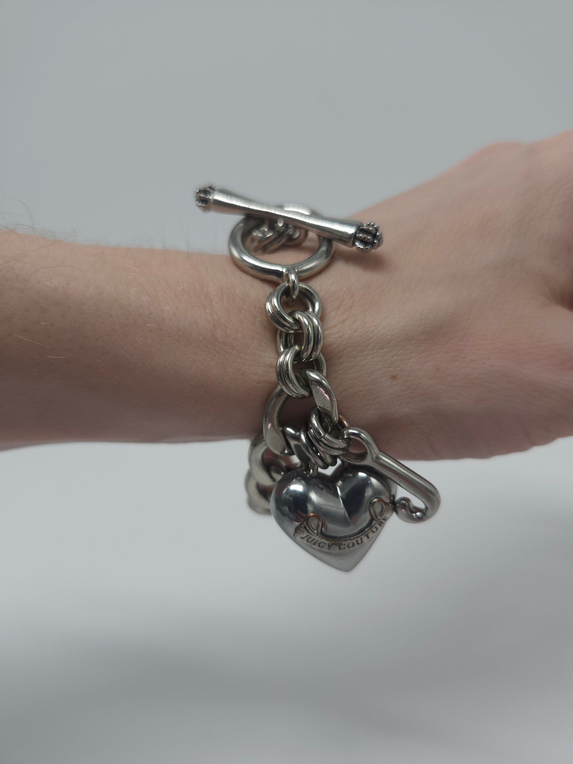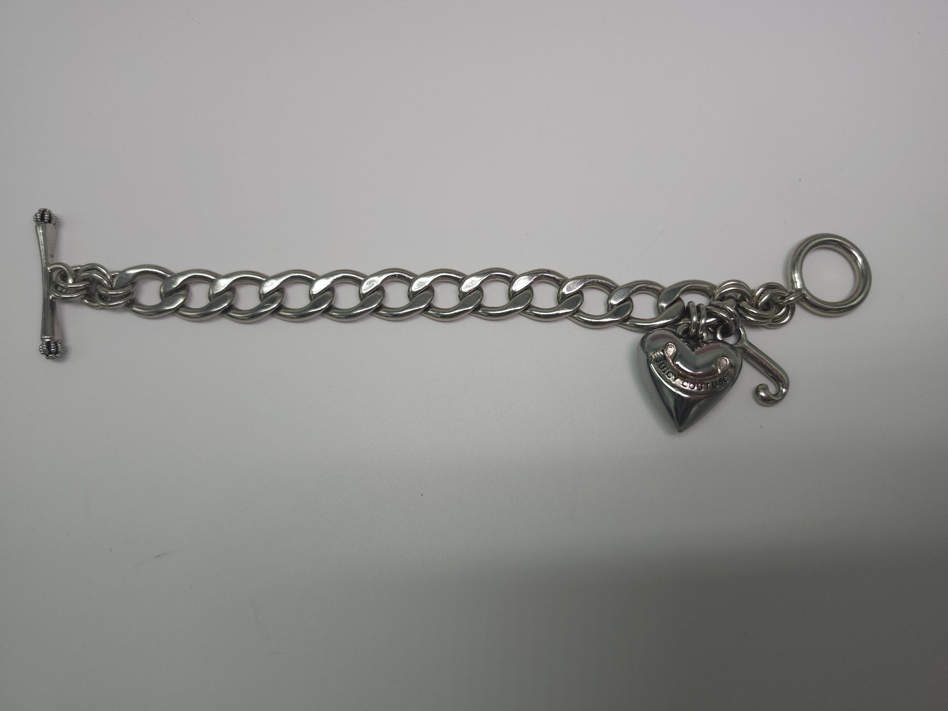 Y2K Juicy Couture Silver-toned Link Multi-Charm Bracelet, 2 charms are "J" and a heart with the company logo across a small banner, sold with its original terry-cloth lined box.
